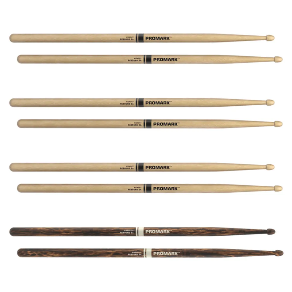 ProMark Bonus Packs deliver quality, reliability, and innovation—all at an incredible value. This 4-pack includes three pairs of our trusted standard Rebound 5A hickory sticks, plus one bonus pair of Rebound 5A FireGrain. Rebound 5A drumsticks feature an acorn tip and long taper, producing a rear-weighted feel that increases agility. With the addition of our exclusive FireGrain treatment, the bonus pair lets you hit harder and play longer, while maintaining the stick’s original weight and balance.