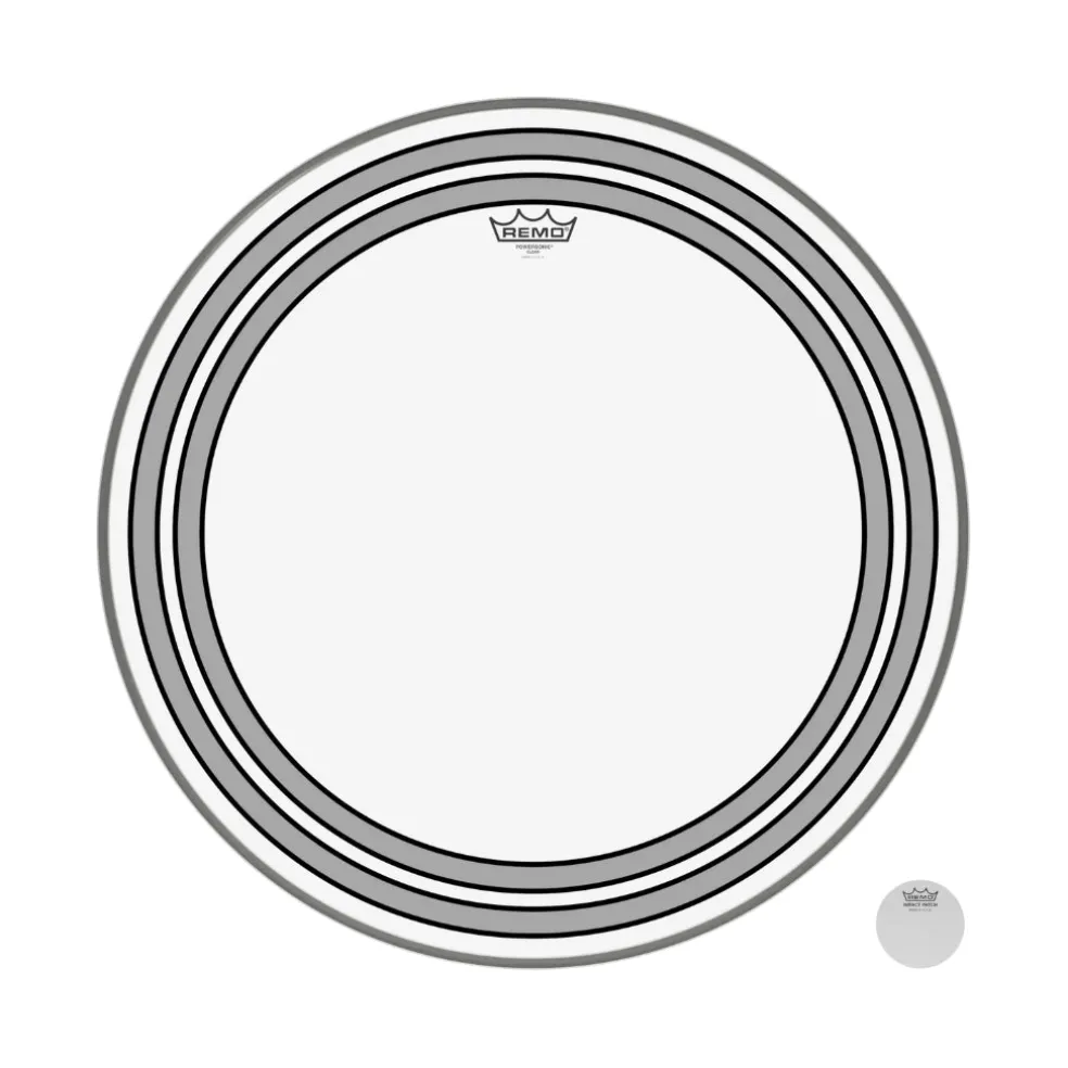 Powersonic® Clear Bass drumheads feature focused lows with increased attack. Constructed with 2-plies of 7-mil and 5-mil Clear film, Powersonic® Clear bass drumheads provide two specifically placed subsonic dampening rings and external snap on dampening system with impact patch for more attack. The external snap on dampening system allows you to customize you sound for different playing situations. Available is sizes 18 – 24.