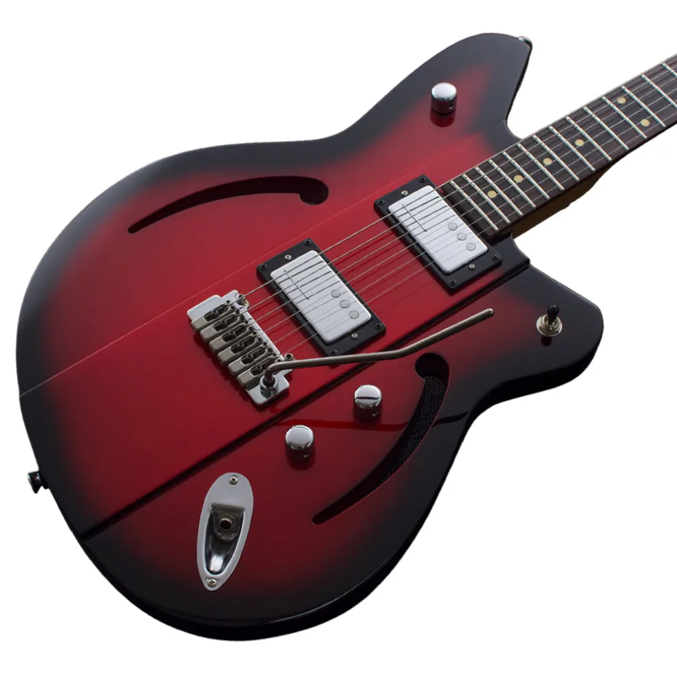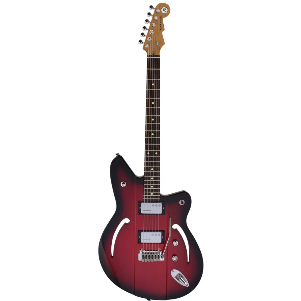 Reverend Founder Joe Naylor has been on a quest to meld a solid body’s sustain and attack with the rich, big tone of a semi-hollow. Naylor’s sonic dream is now a reality with the introduction of the Reverend Airsonic. Radically thinner wings and thru-body f-holes allow the body to resonate intensely, while a thick center ridge establishes solid sustain. Harmonics shimmer, single notes sing, and power chords ring like a bell at stage volume. Add in overdrive, and the controllable feedback is a thing of beauty. With the forearm and stomach contours, this guitar is light and comfortable. The Airsonic W has Railhammer Humcutters that capture the clarity and dynamics of a P90 without the hum. A Wilkinson WVS50 IIK Tremolo in the bridge rounds out the package. If you’re ready to make a unique visual and sonic statement, the Airsonic W is for you!