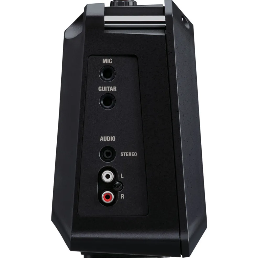 - Three-channel mixer with individual volume controls for microphone, guitar, and audio input