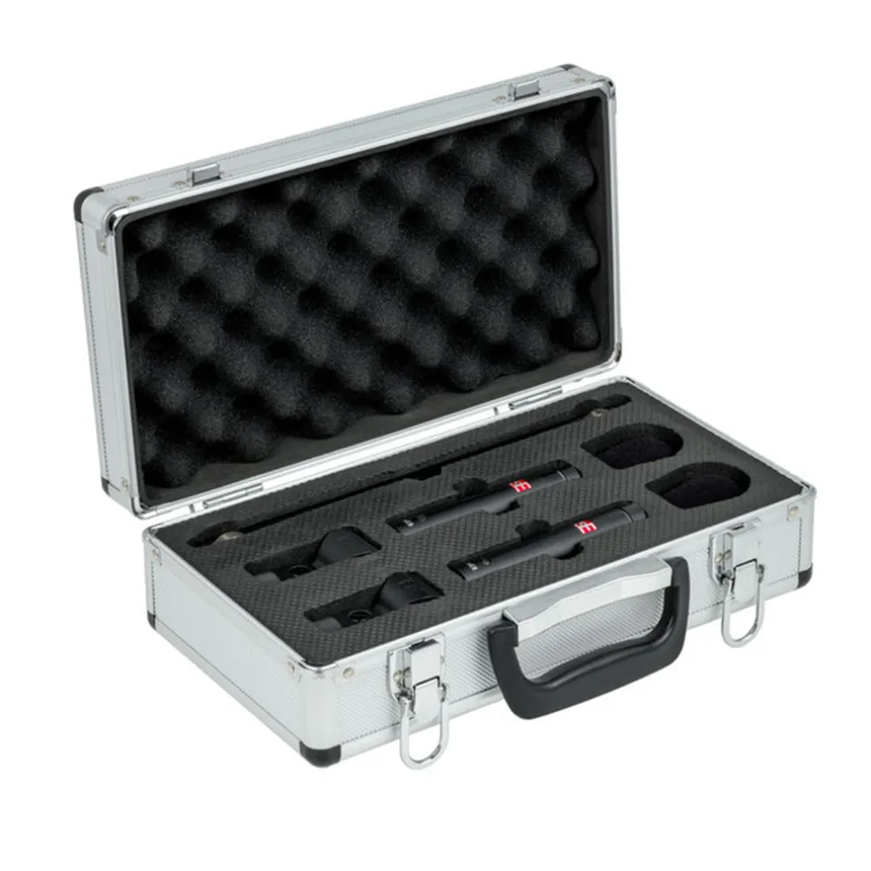 - Includes mic clips, windscreens, stereo bar, and metal storage case