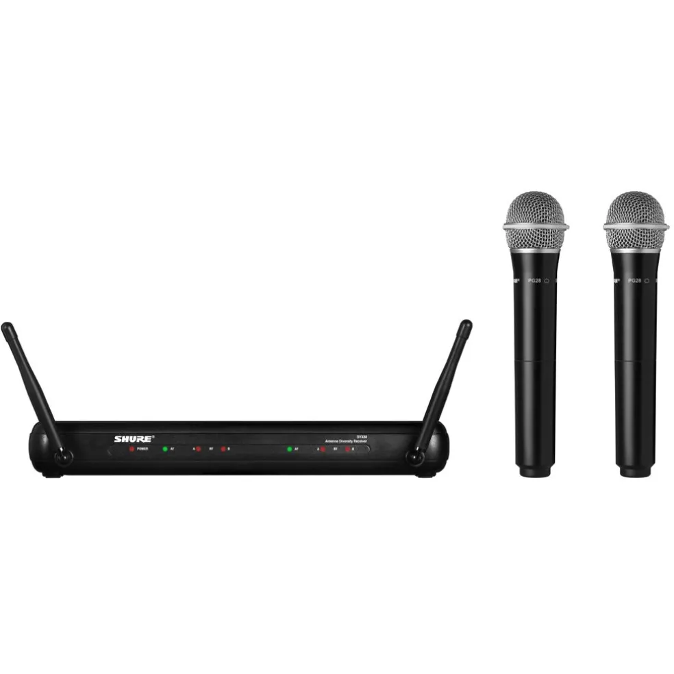 Includes SVX88 Dual Diversity Receiver, Two SVX2 Handheld Transmitters with PG28 Mic Head.