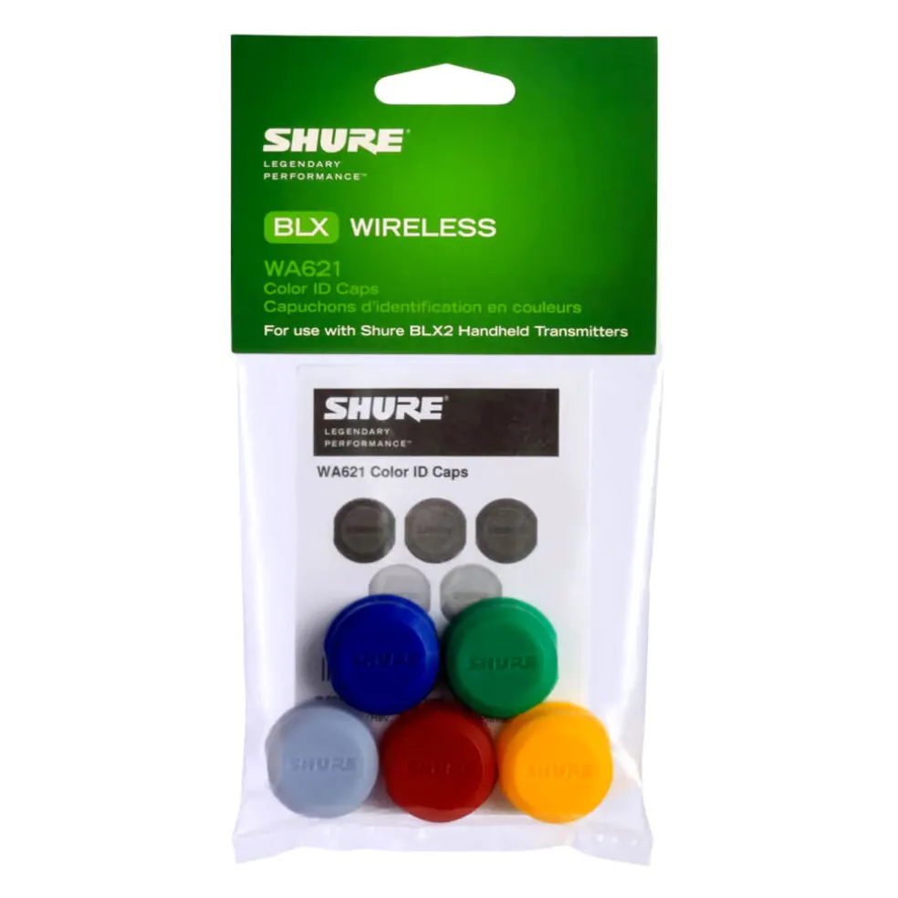 Color ID antenna caps in blue, green, yellow, white, and red differentiate BLX2 handheld transmitters.
