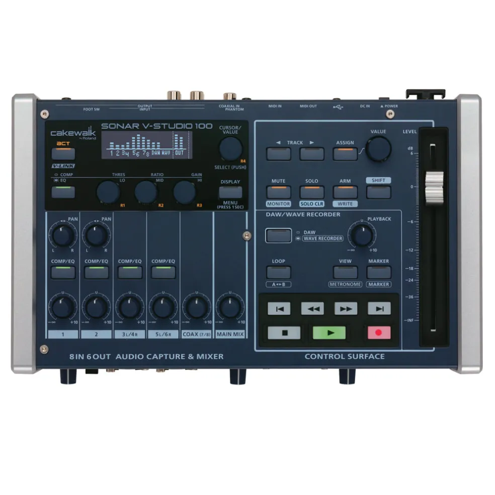 Second product in the SONAR V-Studio line of integrated hardware and software from Cakewalk and Roland provides a compact, feature rich music production studio that enables musicians to create, record, produce, and perform music with or without a computer. SONAR V-Studio 100 integrates a USB `2.0 Audio Interface, DAW Controller, Digital Mixer, SD Recorder, and VS Production Pack for Mac & Windows.