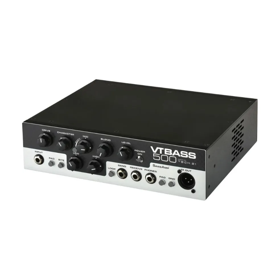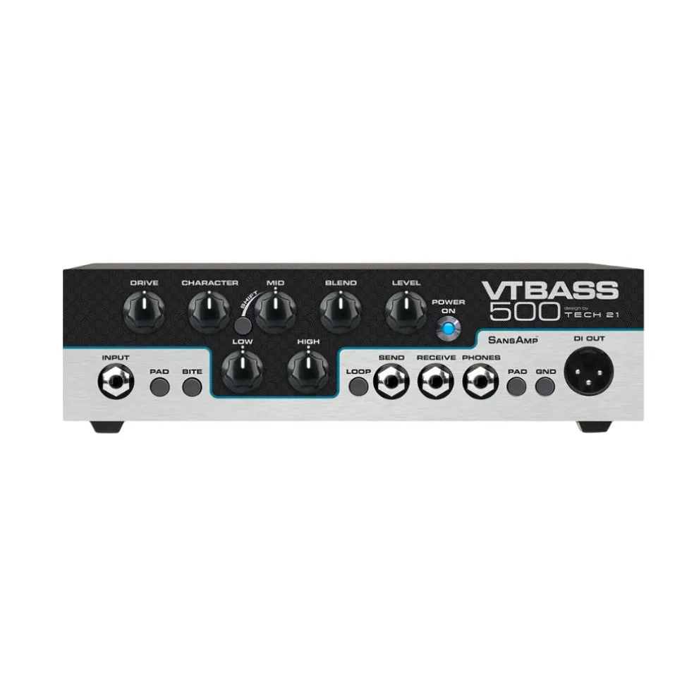 The VT Bass 500 is a 500-Watt bass amp head, with an all-analog SansAmp™ pre-amp and Class D power amp. It is formulated with the same proprietary technology as our SansAmp Character Series VT Bass DI pedal. The unique Character control sweeps through decades of some of the most distinctive bass amp tones on the planet. Drive adjusts the overall amount of gain and overdrive, similar to when the output of a tube amp is being pushed. A Blend control allows you to blend the direct instrument signal with the SansAmp Tube Amplifier Emulation circuitry. The Bite switch activates a presence boost, which tightens up the sound when you are in distorted settings. It also adds definition to your notes when playing in cleaner settings.