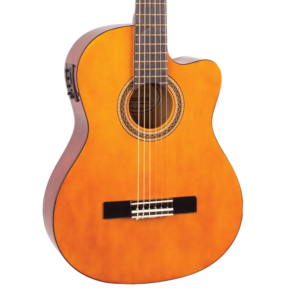 Designed to exacting standards, the Valencia Series 100 cutaway, electric acoustic and cutaway electric acoustic models are available in natural and black gloss finishes. Each electric acoustic model features pickup and pre-amp system combinations built into the guitar: VC104CE – Valencia VPU1, 3-Band EQ Preamp system with a built in electronic tuner. It ensures accurate, high quality amplified sound.