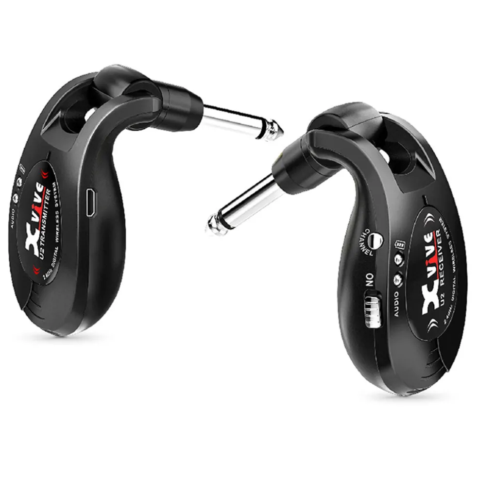 The Xvive U2 guitar wireless system’s digital technology delivers incredible audio quality and a super-reliable connection. It also fits in your pocket! The U2 boasts a full 20Hz-20 kHz frequency response, ensuring that you–and your audience–accurately hear the true sound of your instrument. The system has an unnoticeable 6ms of latency, which means that in addition to your tone, your groove will not be affected! The 2.4GHz ISM band offers crystal-clear wireless broadcast, ensuring the integrity of your signal over 70 feet of range onstage without any signal dropouts. The onboard Li-ion batteries help make the U2 wireless system environmentally friendly, and they last up to 5 hours per charge. The chassis is made out of durable ABS plastic that can withstand the rigors of touring and the harshest of climates. If you use effects, not only can this wireless unit run from your guitar / bass to your pedalboard, you can also use a second U2 system to run from your pedalboard to your amp! No more dodging cables on stage!