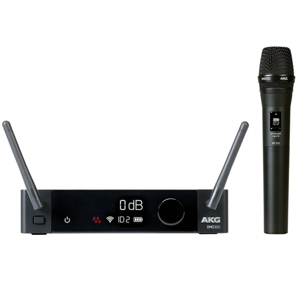 AKG DMS300 professional digital wireless systems for performers and presenters combine signature AKG sound quality and eight channels of rock-solid, license-free 2.4GHz operation with advanced security features, extended battery life and the ultimate ease-of-use. The DMS300 is available in two options: with a high-quality, AKG handheld microphone or with a bodypack. The bodypack is instrument ready and can also be combined with a wide range of AKG headsets or clip-on mics (available separately) for singers or presenters. Leveraging more than 70 years of AKG microphone engineering and offering 24-bit/48 kHz uncompressed audio coding, the DMS300 provides crisp, studio-quality sound with none of the interference found in analog wireless systems. Combined with ultra-low latency, these features make the DMS300 is a joy for singers and instrumentalists. And with the signal security provided by AES 256-bit encryption, presenters can feel at ease in confidential settings. Unrivaled fidelity, security and performance make the AKG DMS300 the ideal digital wireless solution for performing musicians, corporate and government presenters, houses of worship, fitness instructors, educators and anyone who seeks both studio-quality sound and freedom of movement onstage.