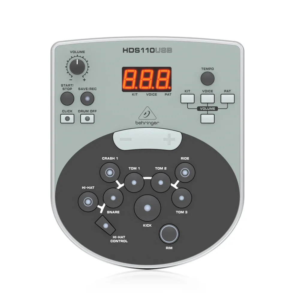 - Includes: – HDS110USB sound module – Kick pedal, pad and stand – 1 x 8? dual-zone snare pad – 3 x 8? single-zone pads – 3 x 12? cymbals – Hi-hat trigger pedal – Drum rack with mounting hardware – Multi-pin breakout cable for easy setup – Pair of drumsticks – Drum tool – Quick start guide and assembly instructions