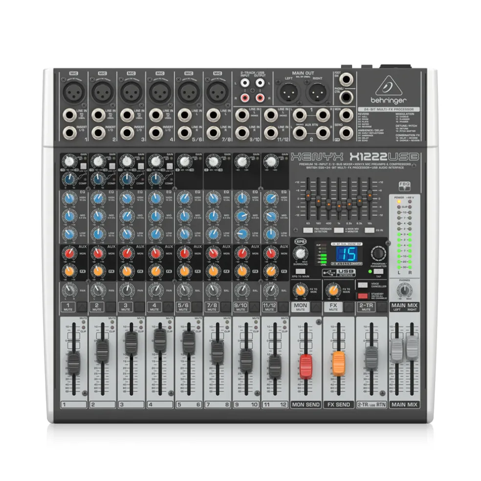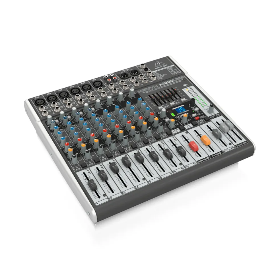 The compact XENYX X1222USB mixer allows you to effortlessly achieve premium-quality sound. Channels 1 – 4 feature our XENYX Mic Preamps, renowned for their pristine performance, plus 2 of the 4 stereo channels accept XLR inputs, as well as Line-Level sources. All mono channels get our ultra-musical “British” 3-band EQs and easyto- use “one-knob” compressors for the ultimate in punch and clarity. Add to this our 24-bit, dual engine Multi-FX processor with 16 editable, professional-grade presets that include reverb, chorus, flanger, delay, pitch shifter and multi-effects – and the X1222USB becomes an incredibly versatile mixer for your live performances.