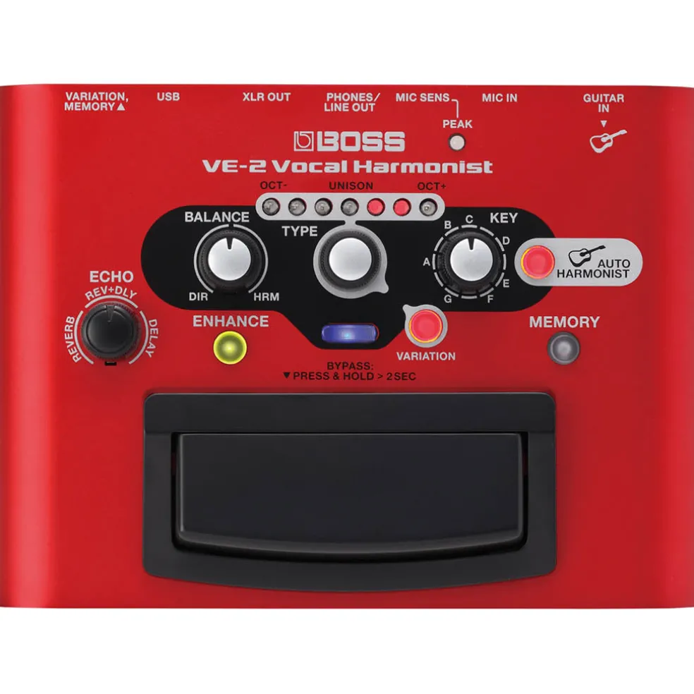 Combining sophisticated sound with simple operation, the VE-2 Vocal Harmonist delivers a complete effects solution for all singers, particularly those that perform with guitar. This portable, battery-powered stompbox has everything you need to create polished, studio-quality sounds everywhere you sing, from concert stages and street performances to practicing and having fun at home. The VE-2 magically creates beautiful harmonized vocals that follow your singing, with pitch that automatically tracks the chords played on a connected guitar, a preset key, or a combination of the two. Using one of these three operation modes, it’s easy to create perfect real-time harmonies in any key, even if you have no experience with gear or music theory. In addition to harmony, the VE-2 provides essential effects to enhance your voice, such as high-quality reverb/delay and an enhancer with real-time pitch correction. Also included is a USB audio function that allows you to connect to your computer and easily capture impressive VE-2 vocal sounds for music recordings, social media videos, and more.