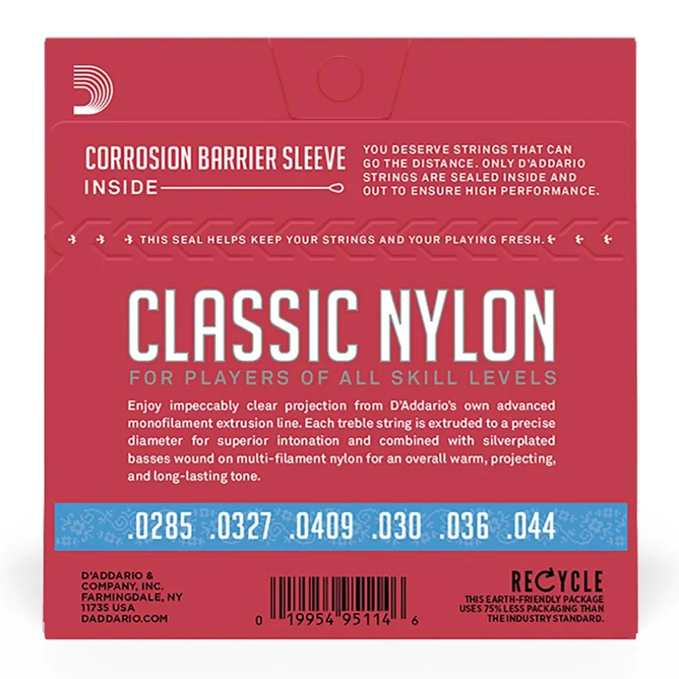 D’Addario’s EJ27H Classic Nylon guitar strings are great for beginners, students and professionals alike. This hard tension set contains 3 clear nylon trebles and 3 silver-plated copper wound basses for the optimal balance of warm and projecting, long lasting tone. Each set is held to same high standards as our professional string sets and may be used for all players looking for an inexpensive, but reliable set. The normal tension set is available for full and fractional 1/2 and 3/4 size classical guitars.