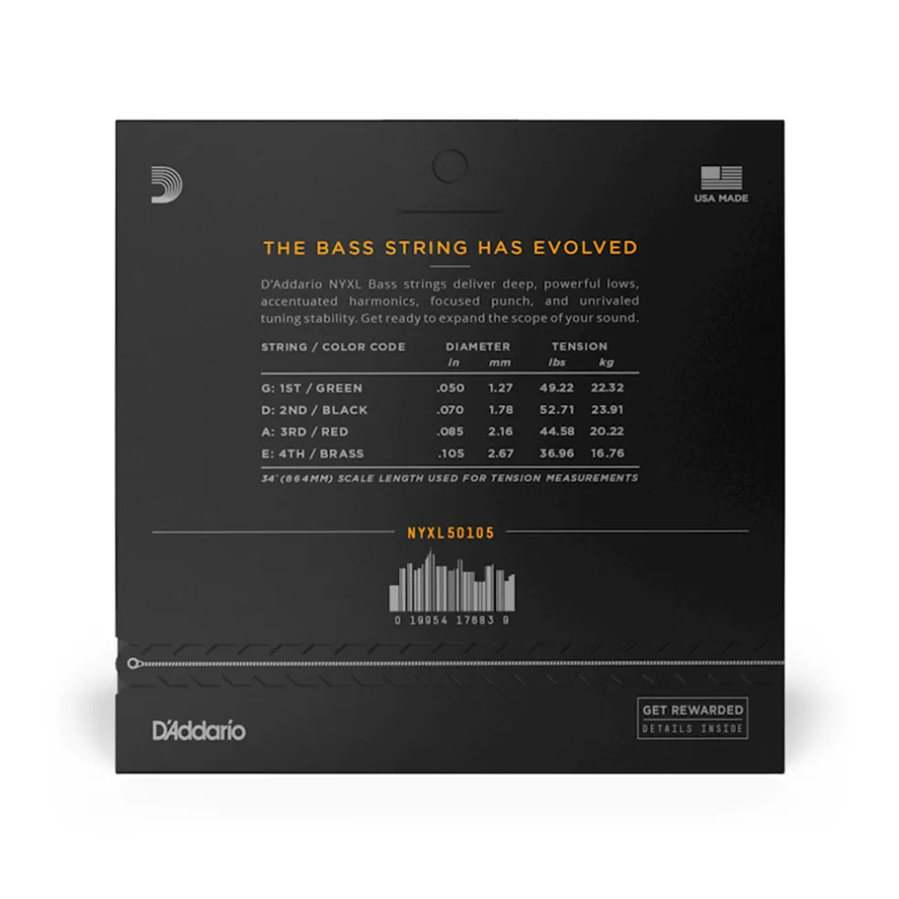 NYXL5015 is a medium gauge string set for long scale basses. The high carbon steel used in NYXL strings offers higher break strength, enhanced tuning stability, and accentuated mid-range