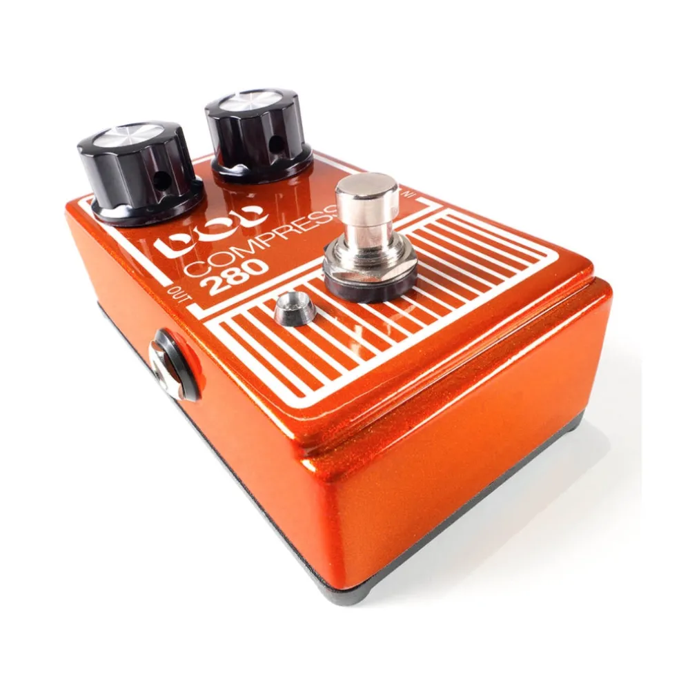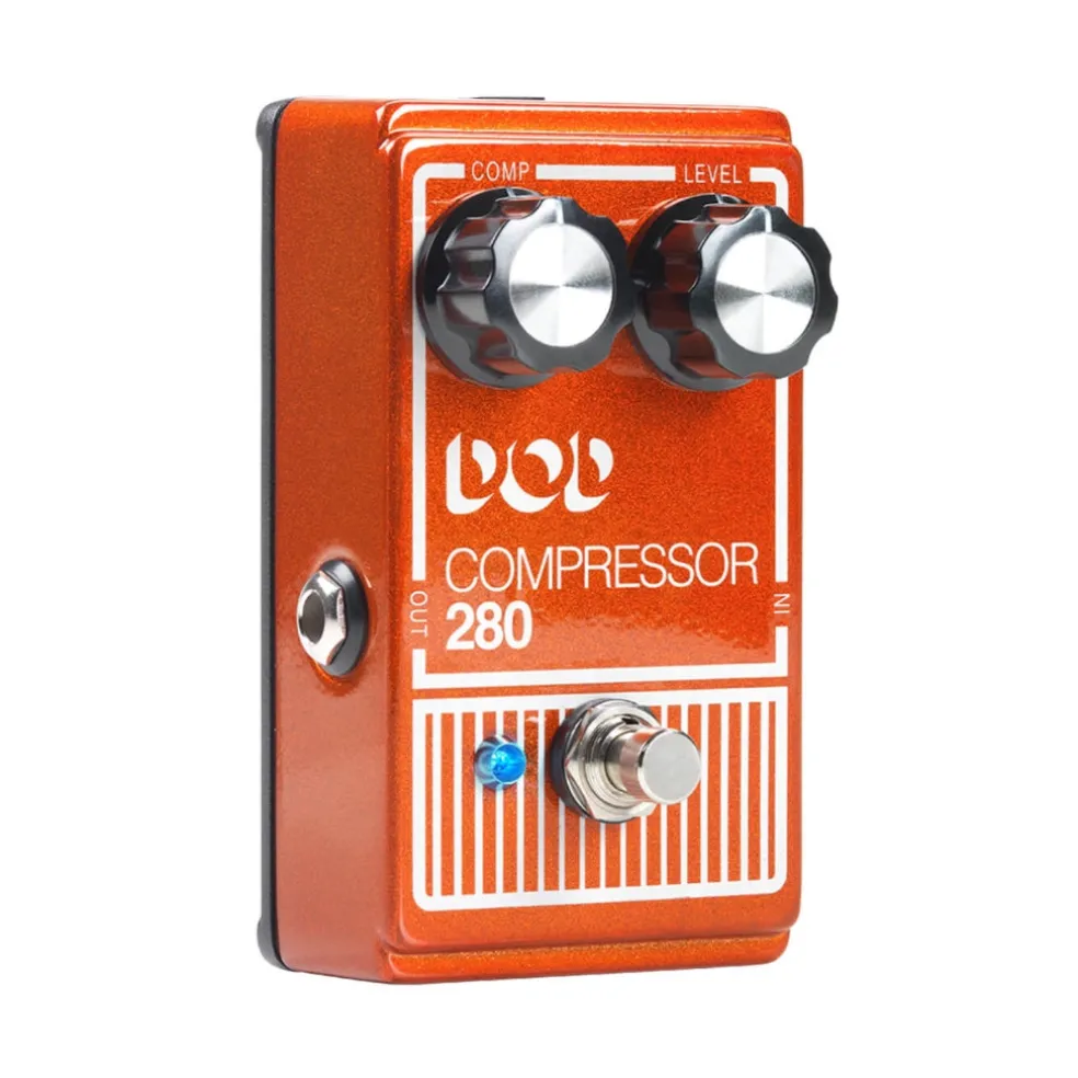 The 280 is an optical compressor that can go from light sustain to utterly smashed with the turn of a knob. Unlike faster non-optical circuits the 280 retains your high frequencies until you get into the more extreme settings. The 280 is ideal for chicken-pickin’, added sustain for leads, or snappy-slappy funk rhythm. The 280 also has enough output to be used as a lead boost with added compressor sustain. And like all of the updated DOD pedal, it has a modern power jack, LED, light but strong aluminum chassis, and true bypass switching.