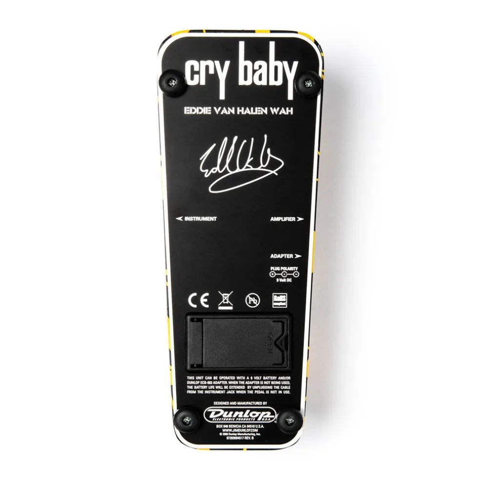 The EVH Wah was developed after intensive design collaboration with the legendary guitarist, Eddie Van Halen. Early on in the process, Eddie handed over his Holy Grail Cry Baby Wah-a standard Cry Baby customized in the early Nineties with a more vocal-like, High Q inductor and a wider frequency sweep. Amazingly, we found that over the years Eddie’s unique wah style, which uses mostly the middle range of the pedal’s action, had carved his own curve into the pot’s resistive element, making the middle range even more defined and increased the low-end sweep. Our clones of the worn-in pot and hand-selected inductor give the new EVH Wah Wah the same Holy Grail feel and tone, and its true hardwire bypass, dual bright blue bypass LEDs, and graphics based on the black and yellow-striped guitar featured on Van Halen II round out this EVH-approved Cry Baby with a voice and look all its own.