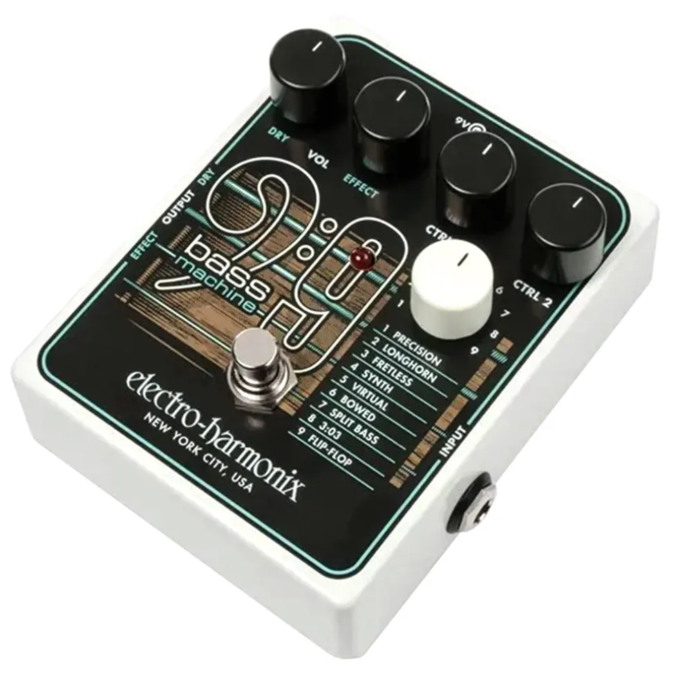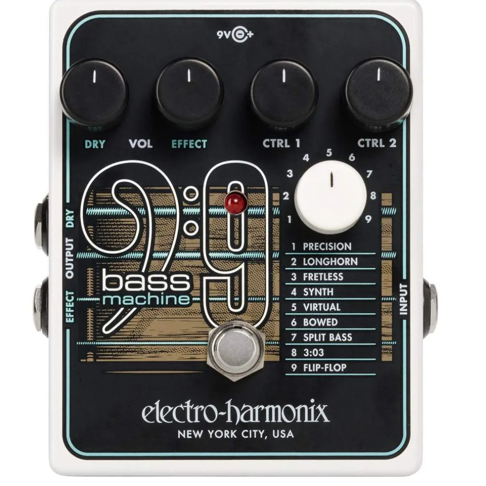 The polyphonic BASS9 Bass Machine transforms a guitar into nine different basses and requires no special pickups, MIDI or instrument modifications. It relies on the same technology powering all EHX 9 Series pedals, like the award winning MEL9® Tape Replay Machine, but features a new algorithm maximized for transposing one to two octaves down with superior dynamics and tracking.