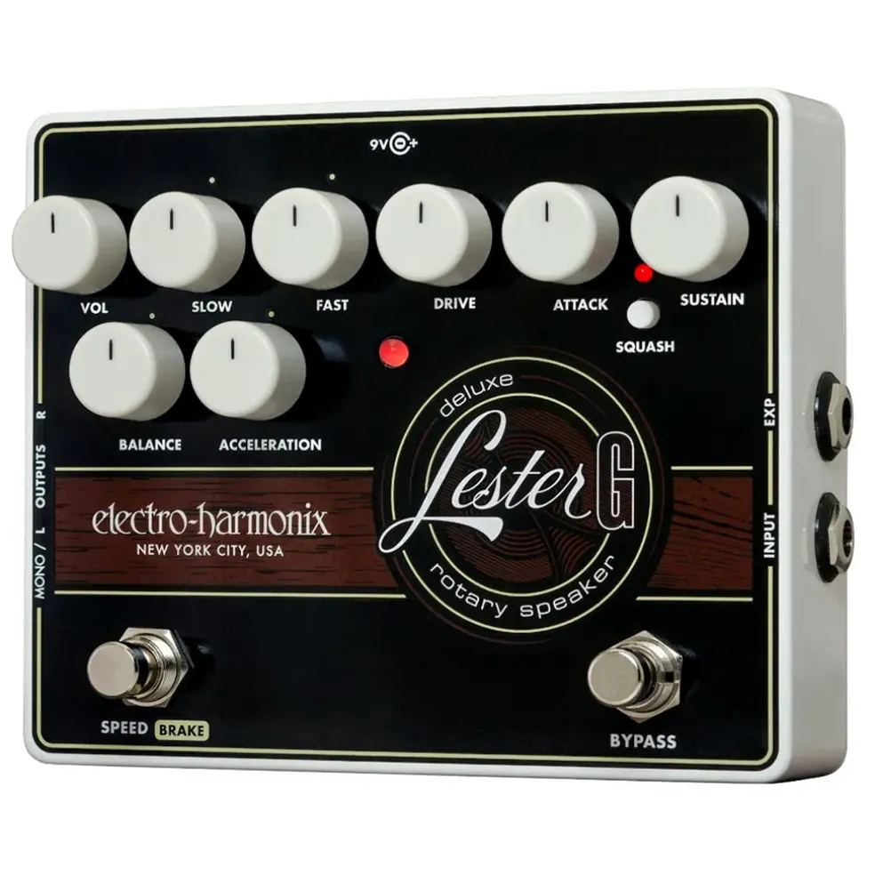 The EHX Lester G uses the finest rotary speaker simulation available today, and comes with a variety of deluxe features. Stereo outputs provide a lush, realistic effect. Tube-emulated overdrive is available with the DRIVE knob, and speaker mix can be fine-tuned with the BALANCE knob. Switch between adjustable FAST and SLOW modes for an accurate reproduction of a classic rotary speaker cabinet’s speed adjustment. An expression pedal jack allows for fine tuning of the rotation speed with an expression pedal.