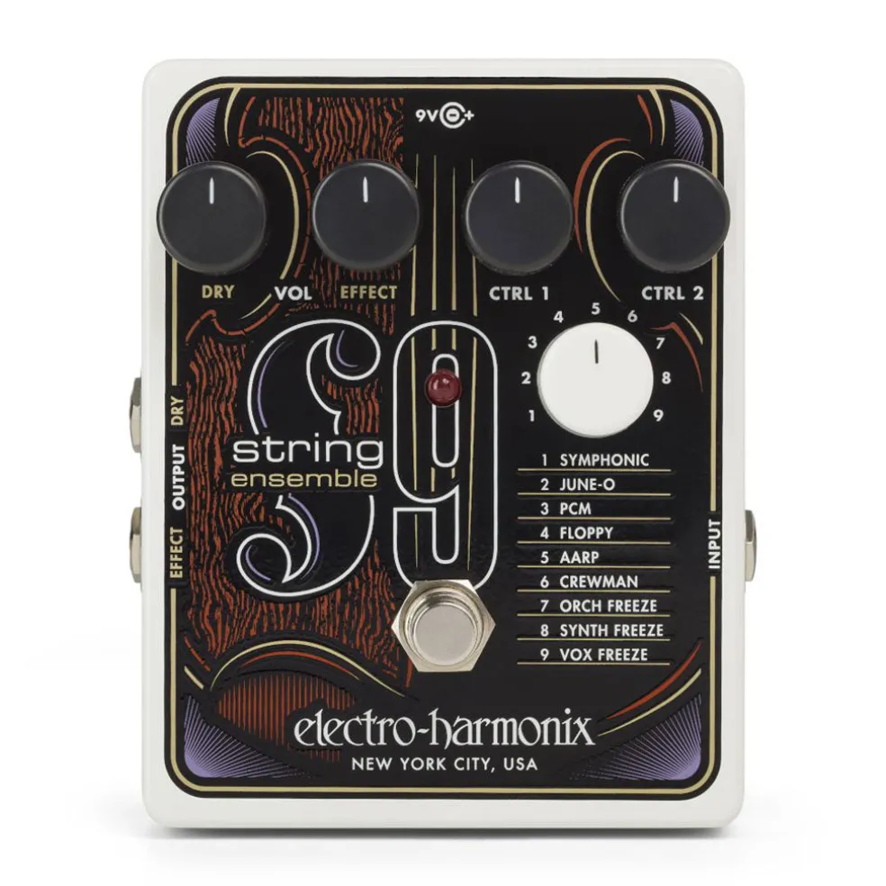 The polyphonic STRING9 String Ensemble transforms a guitar into nine different string ensembles and string synthesizers while requiring zero modifications, special pickups, or MIDI implementation. It relies on the same technology powering all EHX 9 Series pedals. In a 9 Series first, the STRING9 includes the signature EHX Freeze effect on 3 of the presets to sample and hold notes and chords with infinite sustain.