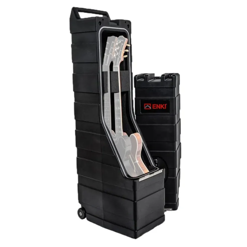 The AMG-2 Guitar Case is a revolutionary 2 electric guitar case offering solid airline-safe protection and travel convenience for touring musicians. Most touring guitar players are carrying multiple guitars and are in need of a case offering a higher level of protection with the ability to easily roll the case into the venue. To keep your babies safe, the Gen 3 ENKI AMG-2 Guitar Case is constructed with an incredibly tough lightweight Roto-Molded Polyethylene shell encasing a luxurious 2 electric guitar modular soft case insert. The AMG-2 Guitar Case is designed to hold most electric guitars with a standard body shape. Guitars can be accessed either horizontally or vertically with the use of a single 304 SS latch. In addition to delivering superior protection, the AMG-2 Guitar Case doubles as a guitar rack when stood vertically – perfect for the stage!