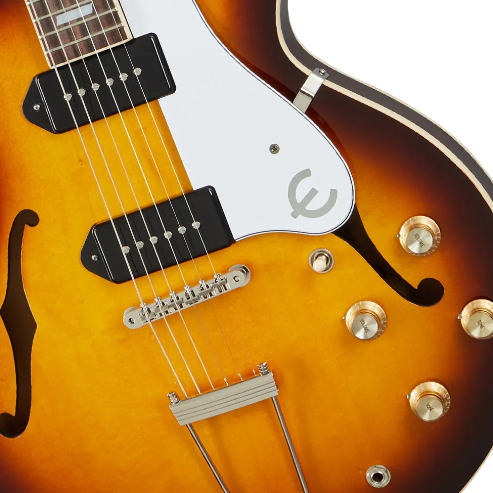 Now made in the USA for the first time in over 50 years! Since its introduction in 1961, the Epiphone Casino™ has been the choice of countless musicians, including Paul McCartney, John Lennon, George Harrison, Keith Richards, Ray Davies, Dave Davies, and Paul Weller. The new Casino from the USA Epiphone Collection features a classic maple and poplar body with a Royal Tan nitrocellulose lacquer finish or a Vintage Sunburst nitrocellulose lacquer finish. The USA Collection Epiphone Casino also features hand-wired electronics with Orange Drop® capacitors and Gibson USA P-90 Dogear single-coil pickups. Featuring Gibson Strings.
