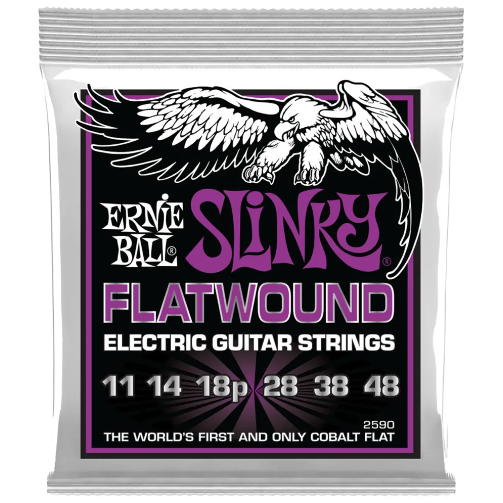 Ernie Ball Slinky Flatwound strings are wound with a patented cobalt alloy ribbon for a round sound with a flat feel and feature a plain g string for easy bending and soloing. Power (11-48)