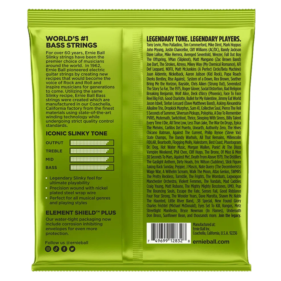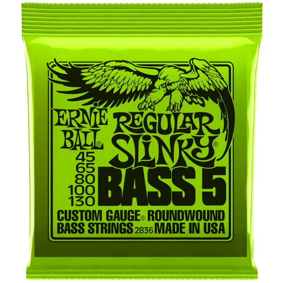 The Ernie Ball Regular Slinky 5-String Nickel Wound Electric Bass Strings are made from nickel plated steel wrapped around a hex shaped steel core wire. Each bass guitar string produces a bright, balanced tone and manufactured with the finest and freshest raw materials in the beautiful Coachella Valley of Southern California.