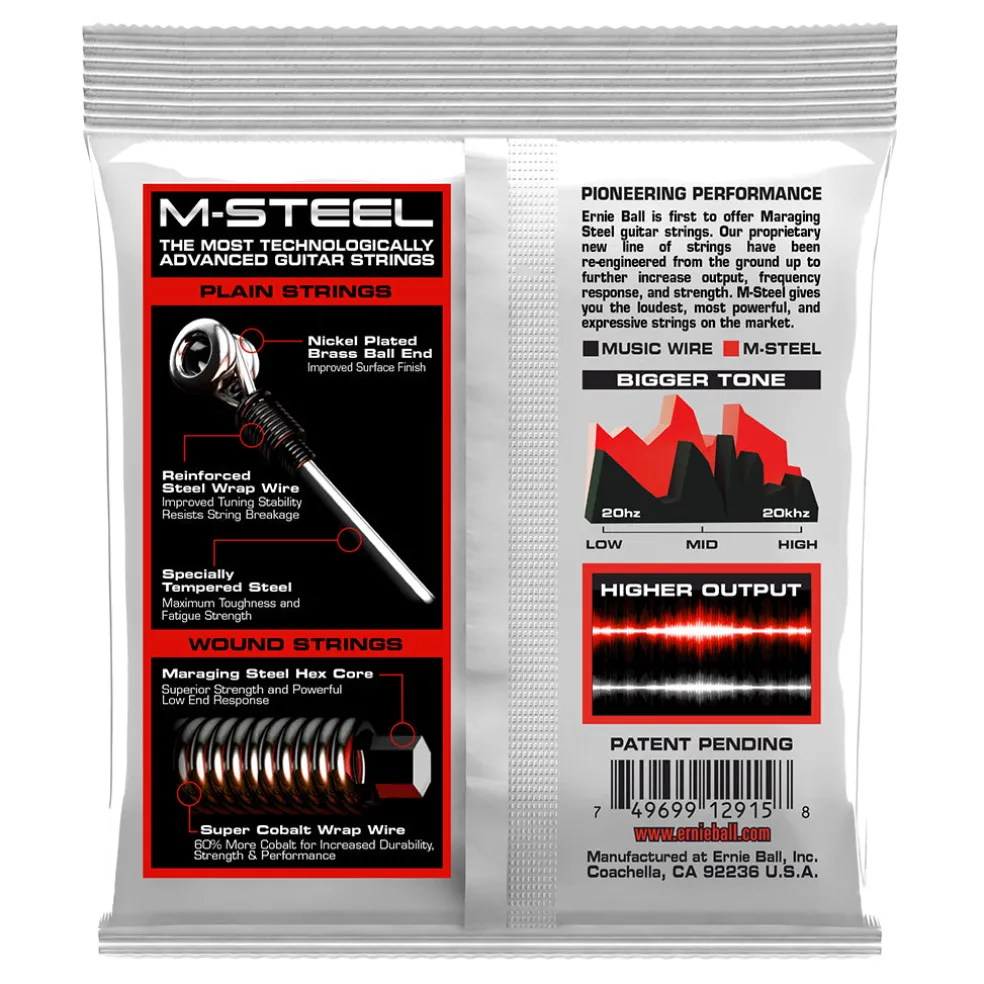 The Ernie Ball Skinny Top Heavy Bottom Slinky M-Steel Electric Guitar Strings are made of a patented super cobalt alloy wrapped around a maraging steel hex core wire, producing a richer and fuller tone with a powerful low-end response. M-Steel plain electric guitar strings are comprised of a specially tempered steel for maximum fatigue resistance. The electric plain strings also utilize a patented winding of steel around the ball end that reduces slippage, breakage and stays in tune better than conventional plain strings. Gauges .010, .013, .017, .030, .042, .052.