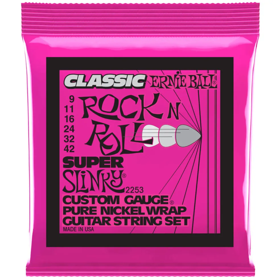 Ernie Ball Slinky Classic Rock N Roll Pure Nickel wrap electric guitar strings are made from pure nickel wire wrapped around tin plated hex shaped steel core wire, these guitar strings produce a warm rich tone with that signature Slinky feel. Gauges .009, .011, .016, .024w, .032, .042.