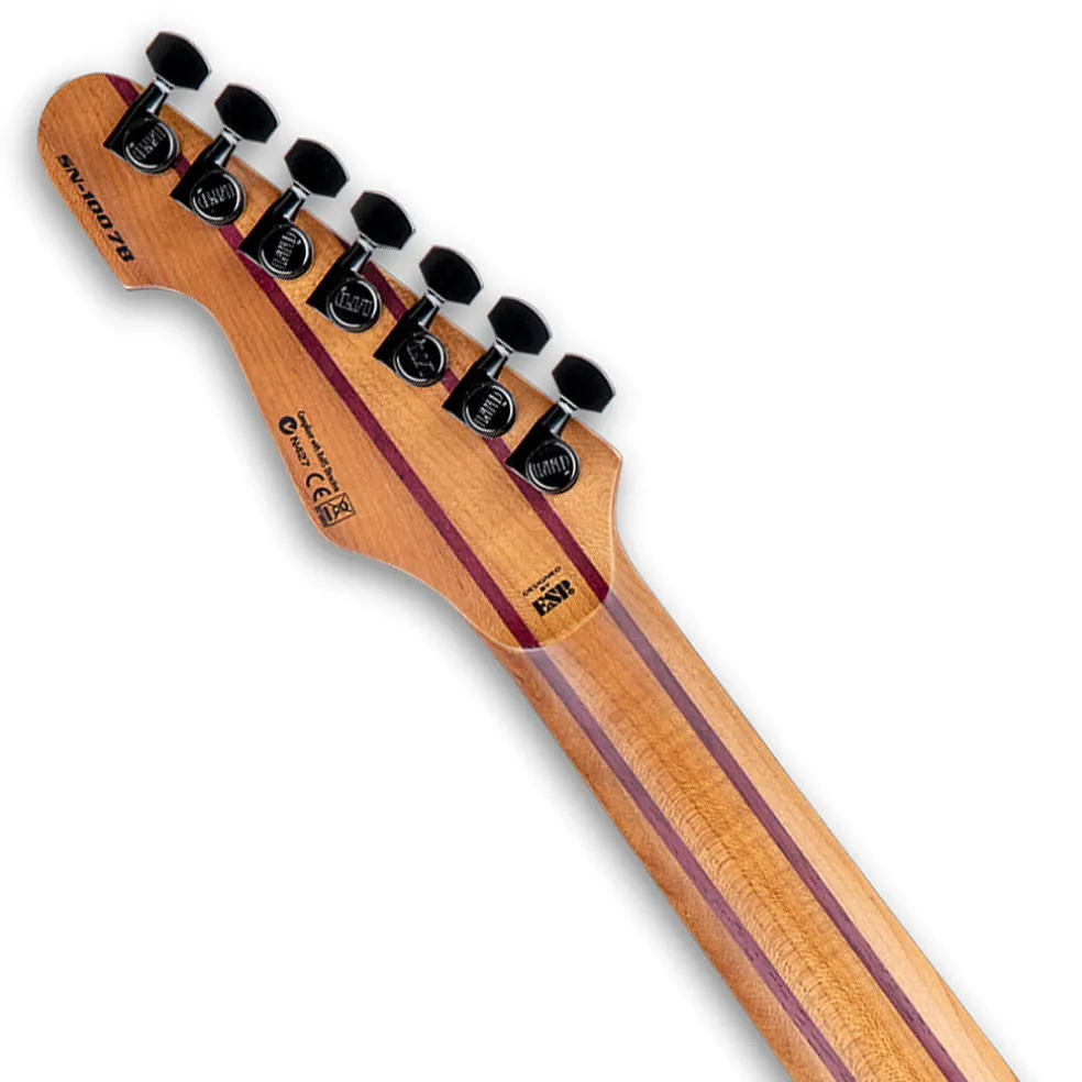 It offers a bolt-on roasted maple neck with a compound radius for maximum speed and comfort. Its Macassar ebony fingerboard includes 24 extra-jumbo stainless steel frets, mother-of-pearl dot inlays, and is scalloped from frets 17-24. Components on the SN-1007HT Baritone include a 48mm black bone nut, a brushed black pickguard, dome control knobs, LTD locking tuners, and a Hipshot hardtail bridge with string thru body. It features a set of Fishman Fluence Modern Humbuckers (alnico in the neck position, ceramic in the bridge), with a push-pull control to activate each pickup’s second voicing.