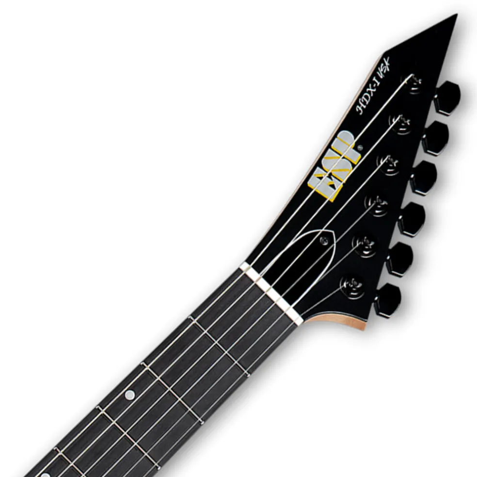 The latest addition to the ESP USA Series, the USA HDX-I is based on the design of the original ESP Horizon-III with its extended upper horn and shortened and scooped lower horn, but adds a flat-top body designed for streamlined, high-performance guitar playing. This guitar uses sturdy bolt-on construction at 25.5” scale for snappy response, with a comfortable, resonant swamp ash body and a three-piece extra-thin u-shaped maple neck. Its outstanding 3-Tone Sunburst satin finish is applied to the open-grain ash body for an incredible aesthetic. The USA HDX-I also features a Richlite fingerboard, a superb material being used in the world’s highest-end custom-crafted guitars, and currently being asked for by many of our top artists for their personal instruments. Known for performance and durability, it is ultra smooth, flawless, and stable, and is fully resistant to warping, expansion, and contraction, even in the harshest weather changes. It also allows the maple neck to handle truss rod adjustment more accurately and easily. As far as sound, Richlite is reflective and loud, with a bright attack which is ideal for aggressive styles. Topped with 24 perfectly crowned and rounded extra-jumbo stainless steel frets, this neck is more like a sword designed for precision accuracy, and built to last a lifetime. Perfectly inlaid mother-of-pearl offset dots add the final touch.