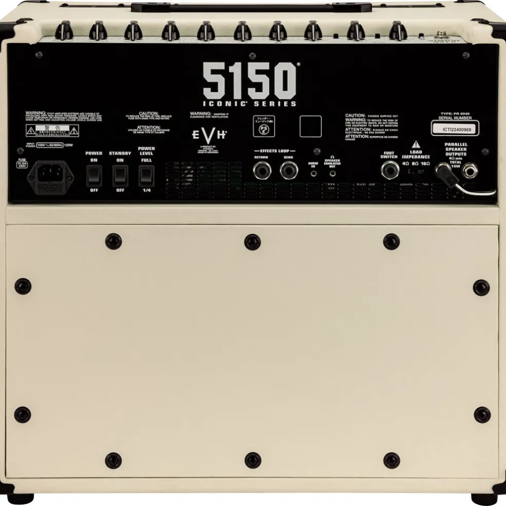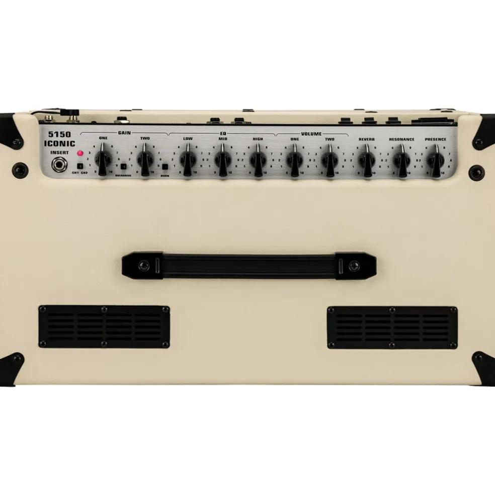 Sporting distinctive EVH style, the 5150 Iconic Series 15W 1×10 combo is wrapped in either Black or Ivory textured vinyl with a black cloth front grille and features silver and black 5150 and EVH logo badges in the upper left and lower right corners. This all-tube combo is finished off with a brushed aluminum top panel, vintage-style chicken-head knobs and molded black plastic top handle. A high-quality fitted cover is available as an EVH Accessory.