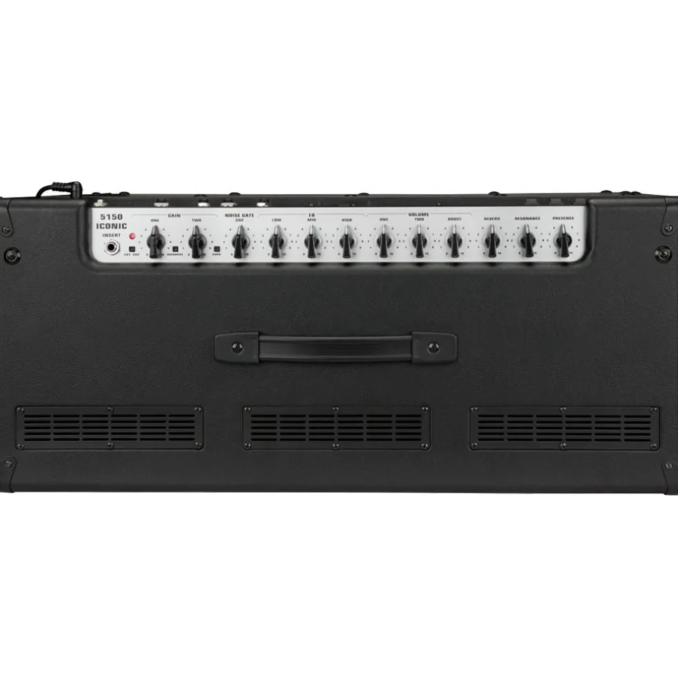 Sporting distinctive EVH style, the 5150 Iconic Series 60W 2×12 combo is wrapped in either Black or Ivory textured vinyl with a black cloth front grille and features silver and black 5150 and EVH logo badges in the upper left and lower right corners. This all-tube combo is finished off with a brushed aluminum top panel, vintage-style chicken-head knobs and molded black plastic top handle.