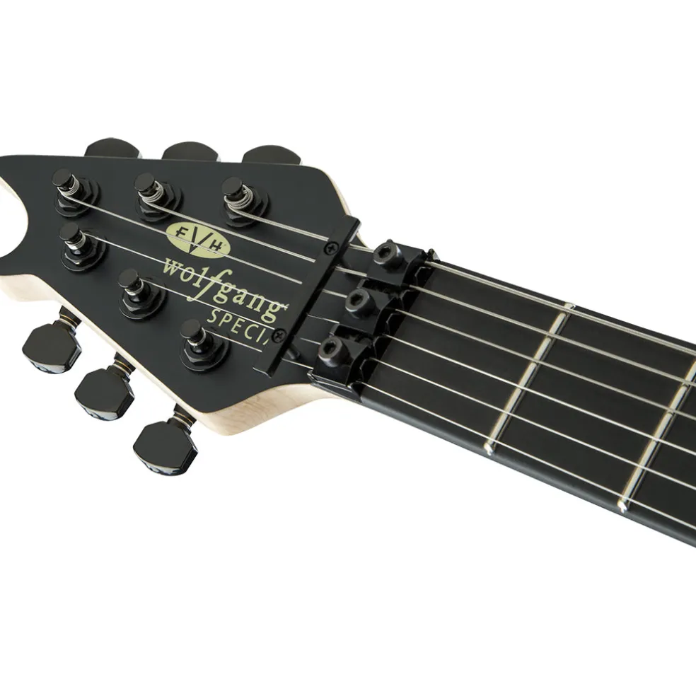 The EVH Wolfgang Special features an arched top basswood body with a flame maple top and a robust graphite-reinforced bolt-on quartersawn maple neck, carved and rolled to Eddie’s exacting specifications. Primed for energetic riffing and blazing leads, its 12”-16” compound radius maple fingerboard has a hand-rubbed urethane back finish with 22 jumbo frets and black dot inlays.