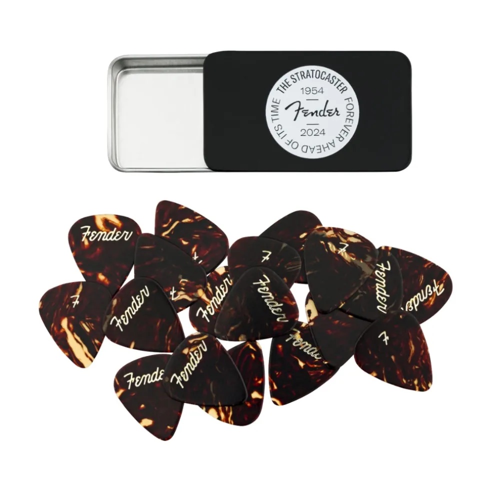 Celebrate the 70th Anniversary of this beloved instrument with the 70th Anniversary Pick Tin. Stamped with the original logo dies used in the 1950’s on the first Fender® guitar picks, this pick tin contains 12 medium celluloid picks in classic tortoiseshell. Celluloid is a premier pick material and has been the cornerstone of the Fender pick collection for decades. Celluloid picks give the traditional feel and a warm, round musical tone. The traditional 351 shape, Fender’s most popular pick design, is a perfect accessory for players of versatile styles and techniques. Pay tribute to the iconic 1954 Stratocaster® with this collector’s tin.