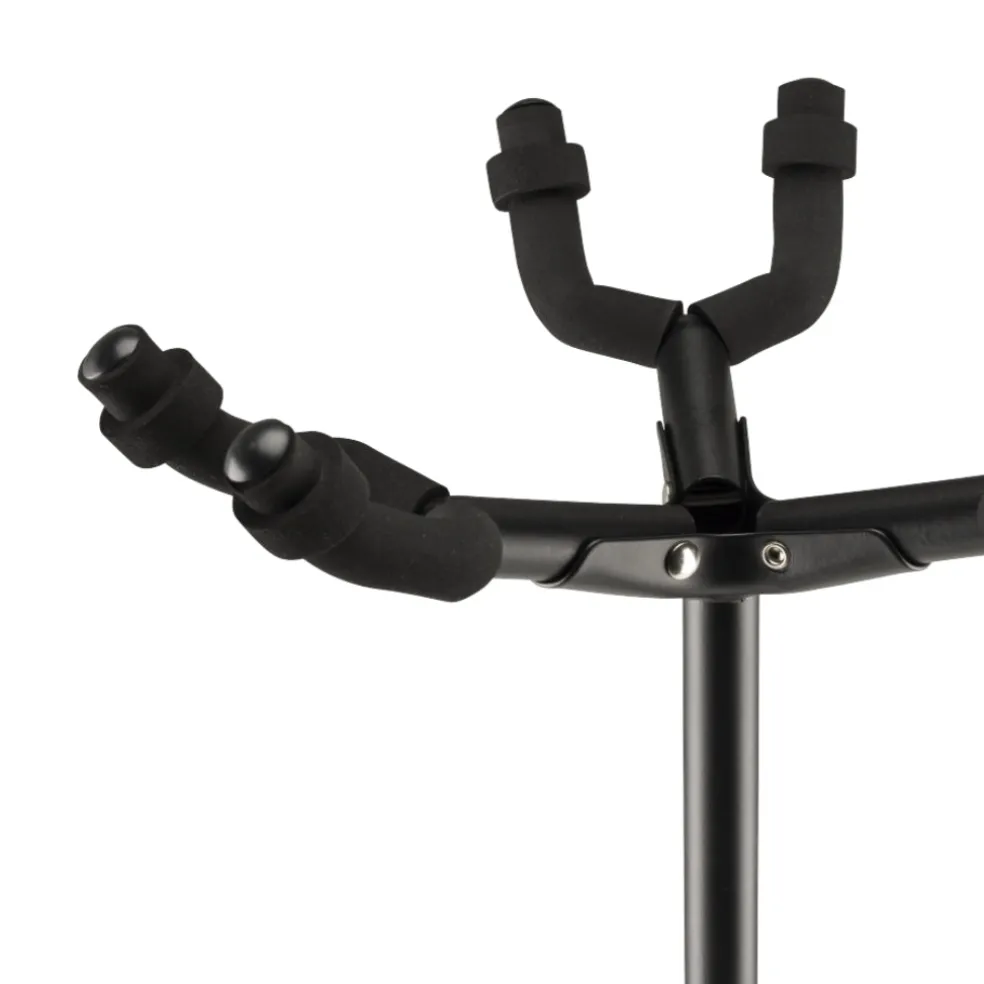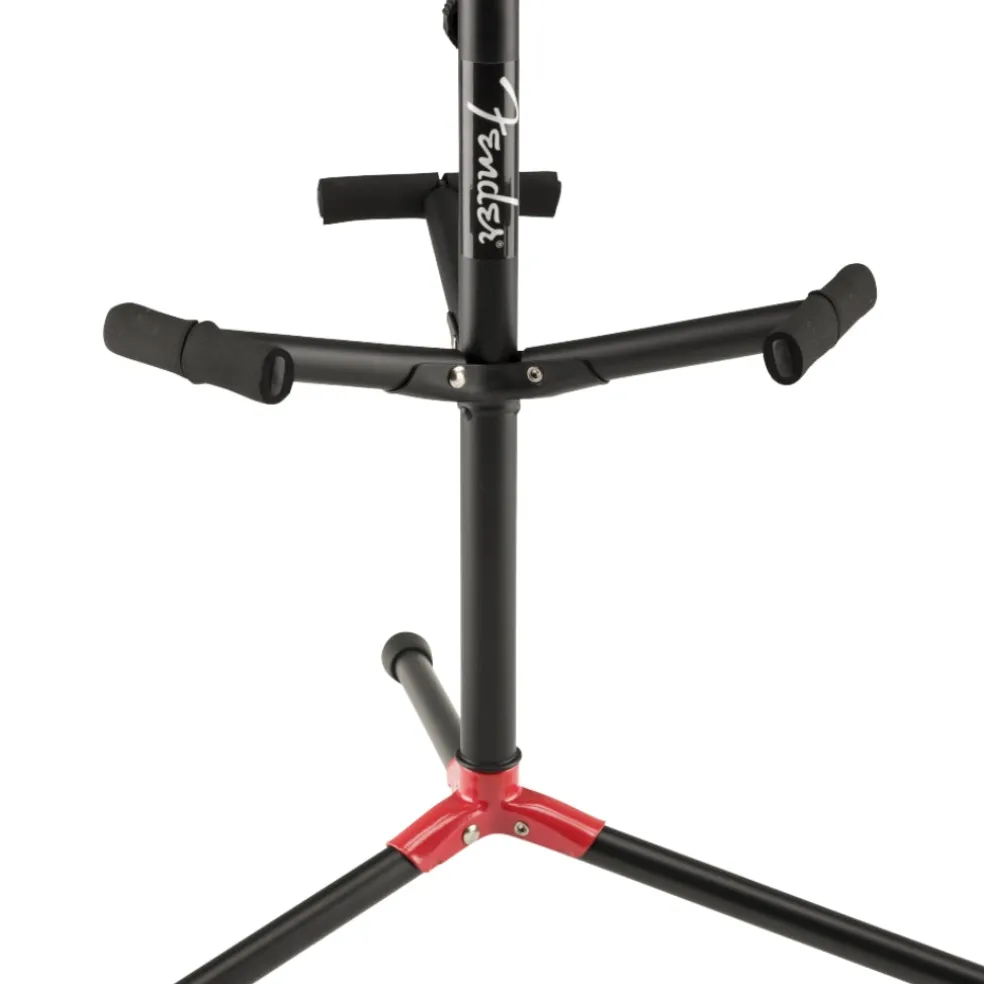 Fender’s Adjustable Hanging Guitar Stand conveniently showcases your acoustic, electric or bass guitar. The height-adjustable neck yoke comfortably accepts various instrument sizes while the lower support swivels to accommodate standard and offset body styles. This stand’s metal construction is durable enough for road use, and padded yokes offer security while in use. Perfect for the musician on the go, this stand is easily collapsible for convenient transport.