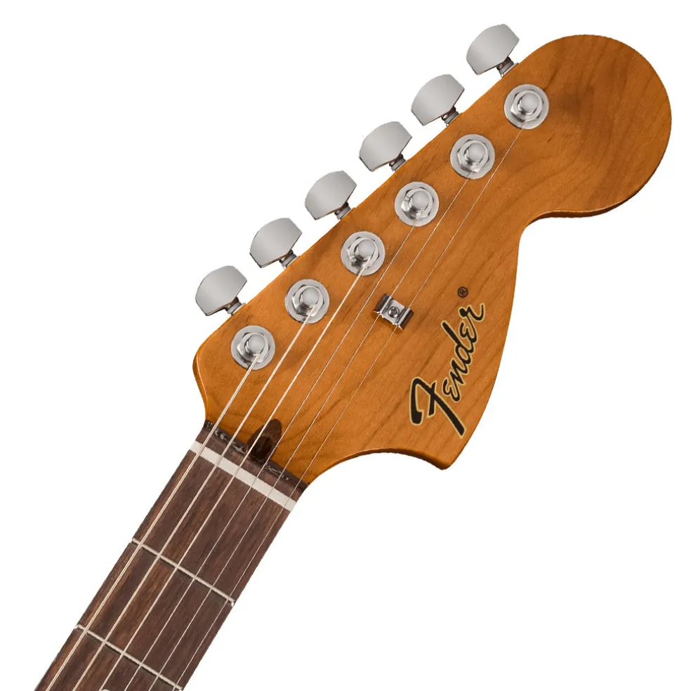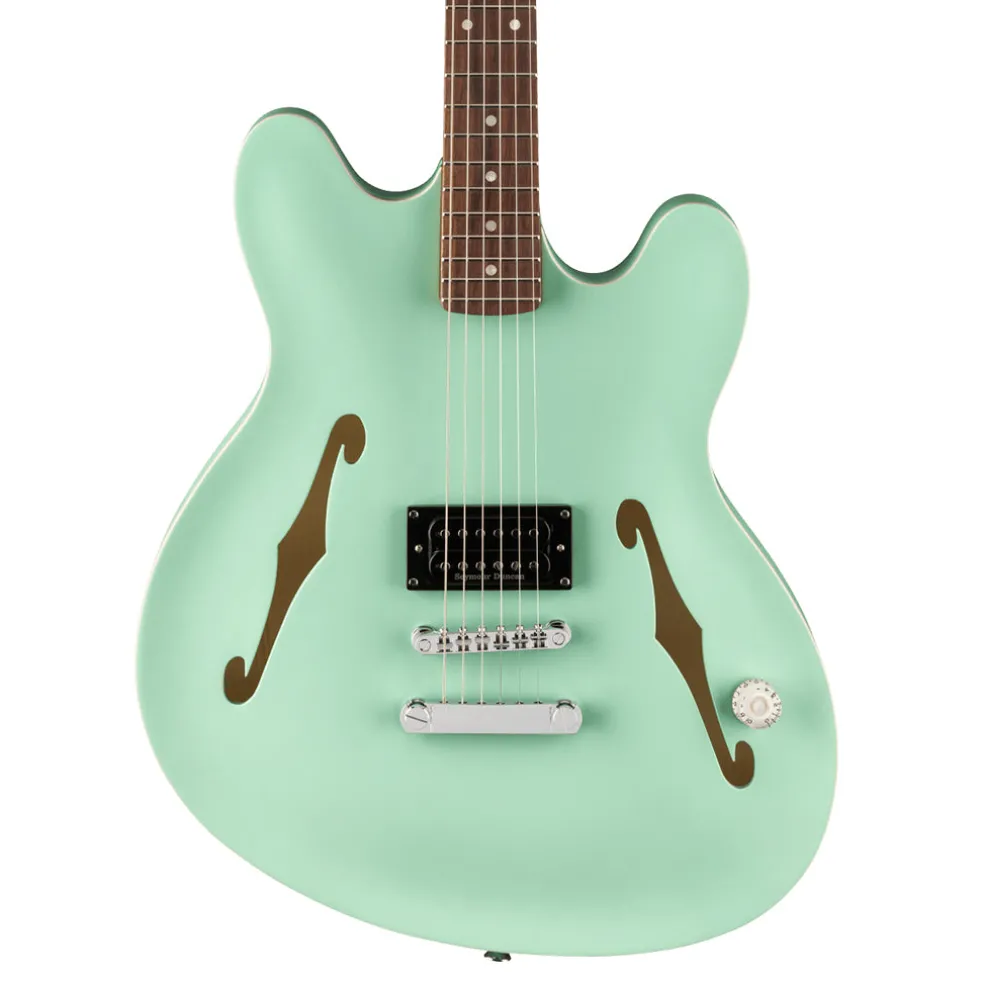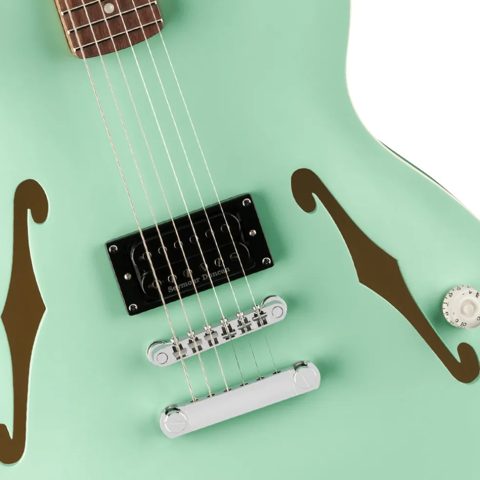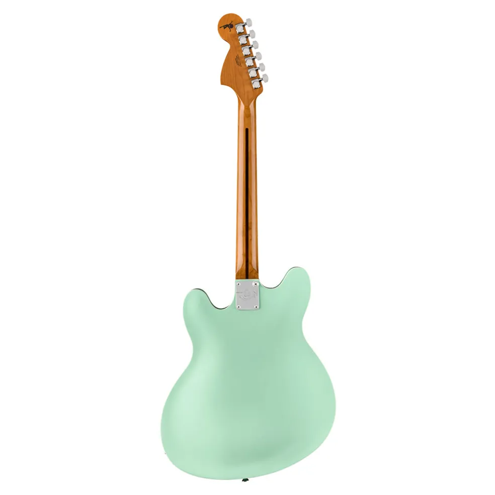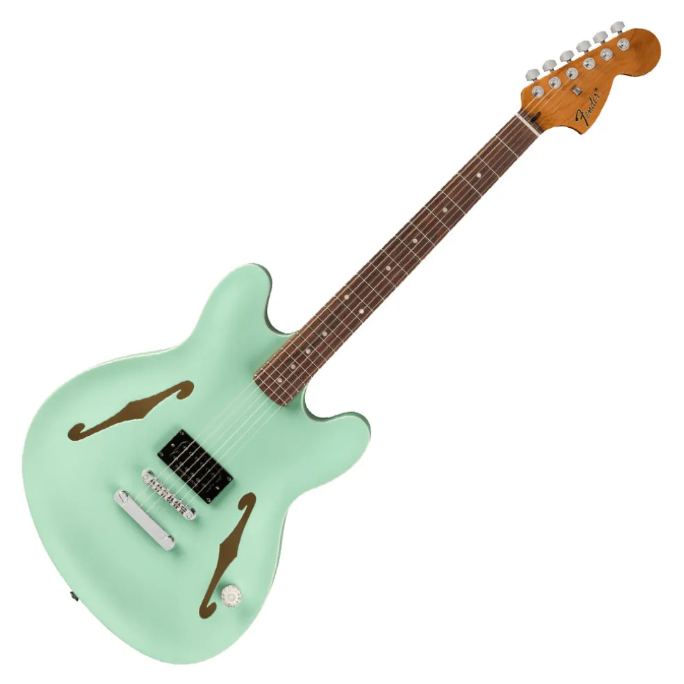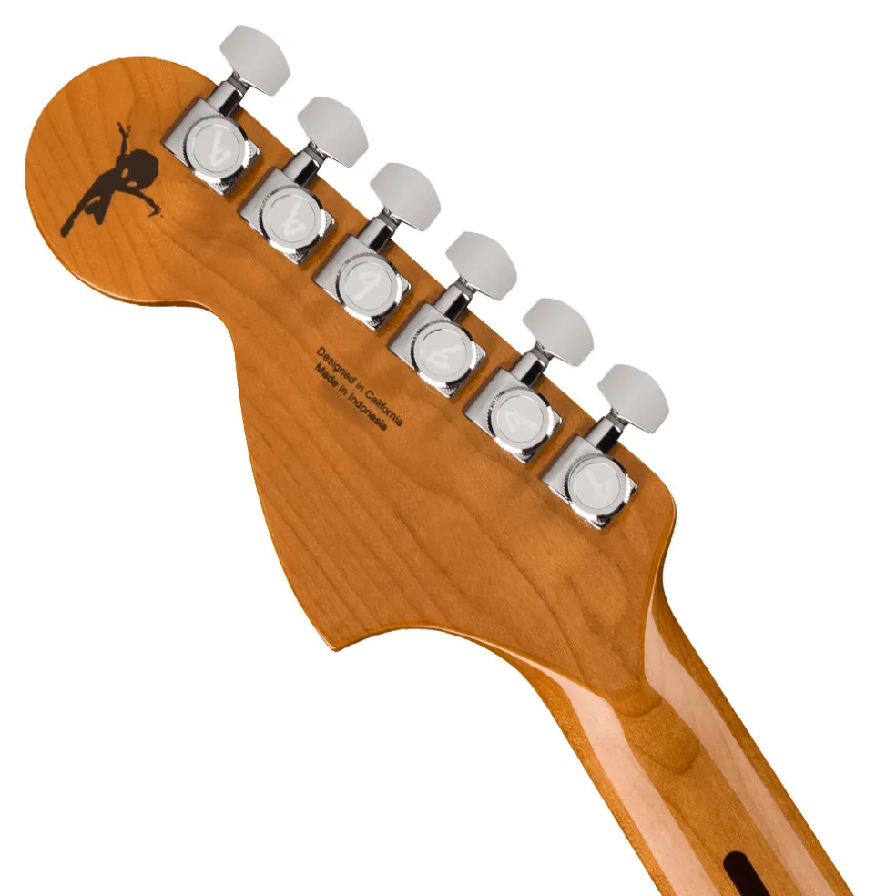 Designed with an offset semi-hollow body, the Tom DeLonge Starcaster boasts a Seymour Duncan® SH-5 Duncan Custom™ humbucker for turbo-charged tone that’s perfect for chunky power chords and crunchy riffs. But it’s not all about power — the streamlined control setup consisting of a single master volume combined with a treble bleed circuit preserves the guitar’s natural high-end, ensuring sparkly cleans and chime-y edge-of-breakup tones. The comfy modern C neck features medium jumbo frets on a 12-radius rosewood fingerboard for a modern feel with superior playability. Other highlights include Fender locking tuners for rock-solid tuning stability and fully adjustable bridge with stop tailpiece for classic looks, superior setup adjustment and enhanced tuning stability. DeLonge’s original signature artwork is featured on the back of the headstock and custom crafted neck plate.