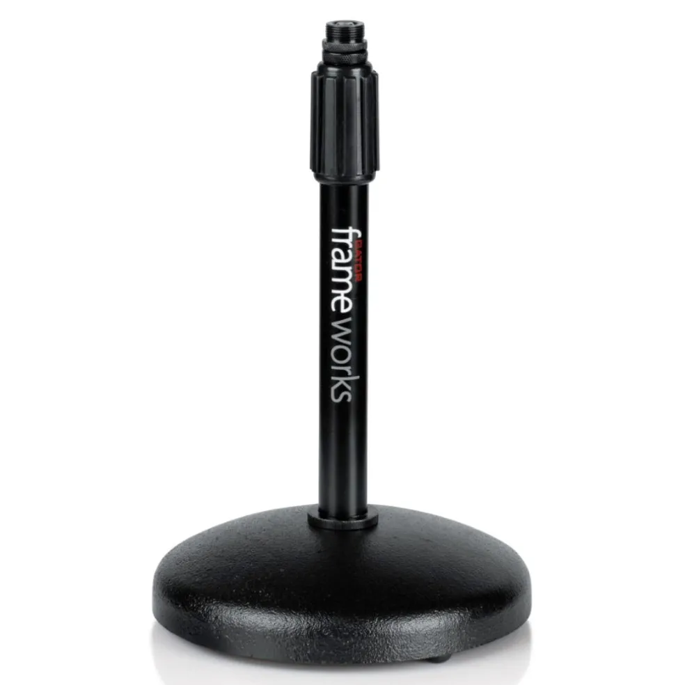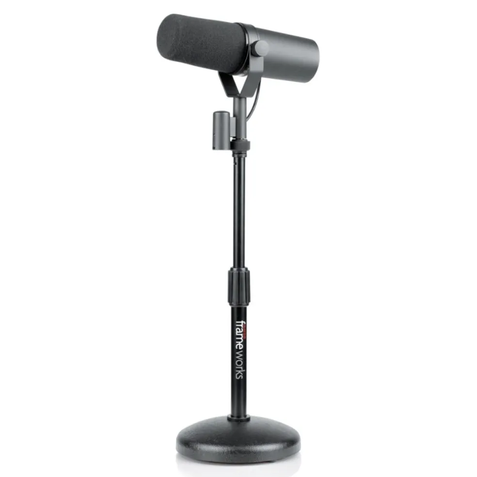 Desktop microphone stand with round weighted base & adjustable height.