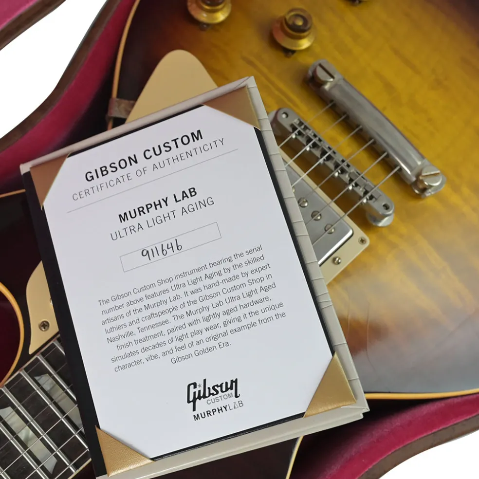 Gibson Custom Shop’s 1959 Les Paulâ„¢ Standard Reissue is not just a tribute to the priceless original models — it’s a clone of them. From laser-scanned dimensions to chemically-recreated plastics to color-matched shades of sunburst, every element has been rendered in unbelievable detail. It represents the culmination of decades of work by Custom Shop’s expert team — a tireless quest to bring accuracy and authenticity to the hands of fans. It’s the definition of cool, and it’s the best representation of the 1959 Les Paul Standard since the Gibson Custom Shop began making Historic Reissues over twenty-five years ago. It features Ultra Light Aging by the skilled artisans of the Murphy Lab. The Murphy Lab Ultra Light Aged finish treatment, paired with lightly aged hardware, simulates decades of light play wear, giving it the unique character, vibe, and feel of an original example from the Gibson Golden Era.