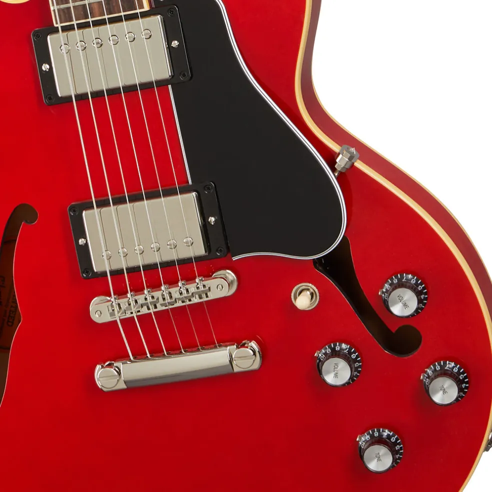 The Gibson ES-339 is a modern classic designed for those seeking the tone and look of an ES-335, but desire a slightly smaller, lighter instrument. The pearloid dot inlay rosewood fingerboard on a hand-rolled Rounded C mahogany neck remind players where it all started. The 57 / 57 Classic + humbuckers paired with our hand-wired tone circuit showcases the versatile Gibson ES tone that players have craved for over 60 years. Tuning stability and precise intonation are provided by the Grover Rotomatic tuners with Kidney buttons paired with light-weight Aluminum ABR-1 bridge and Stop bar tailpiece. Impressive gloss finishes include Cherry, and Trans Ebony.