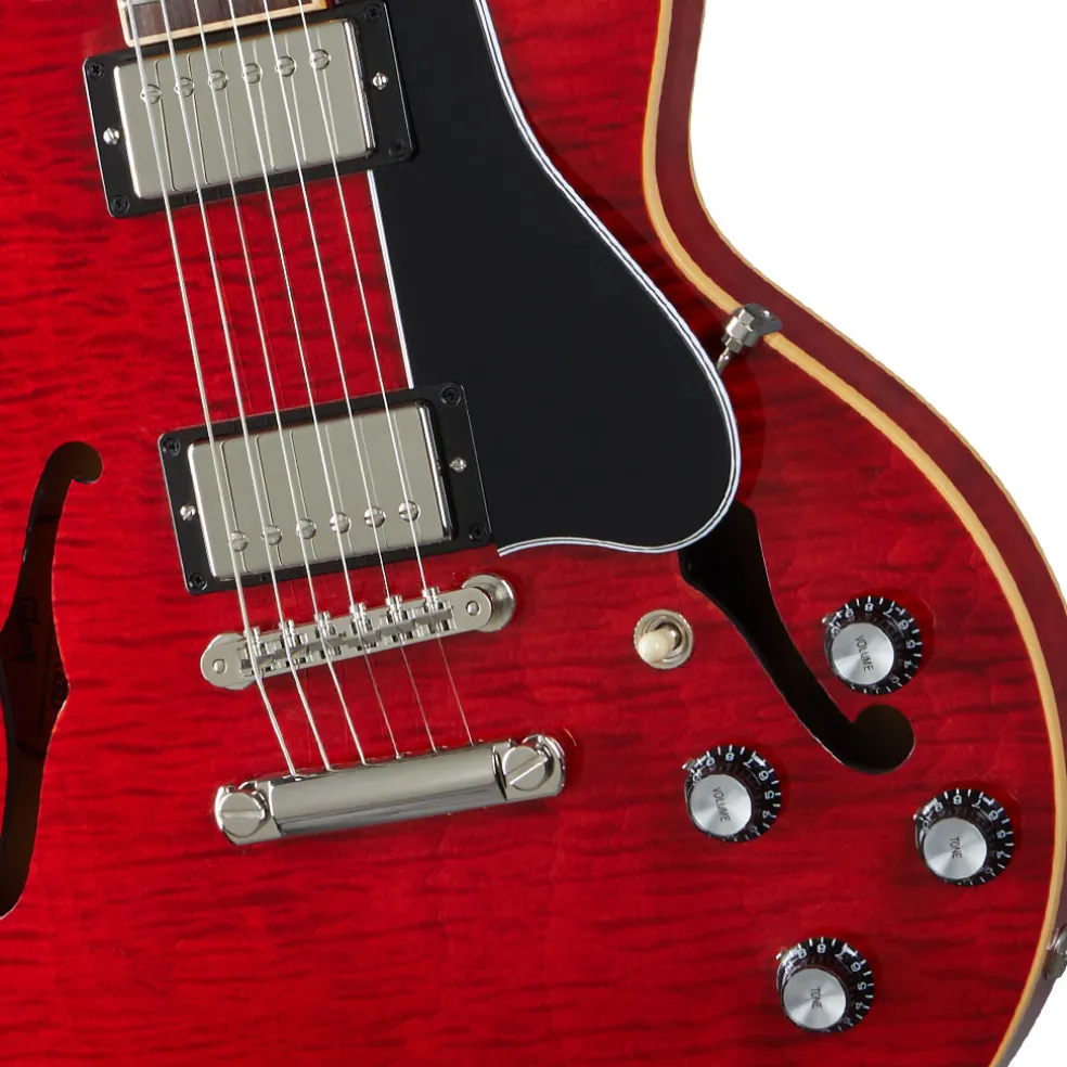 The Gibson ES-339 Figured is a modern classic designed for those seeking the tone and look of an ES-335, but desire a slightly smaller, lighter instrument. Crafted with a maple centre-block, and quarter-sawn spruce bracing, players will be impressed by the lightweight feel and expanded range of tonal capabilities. Equipped with high-end appointments like our hand-wired control assembly with 500K potentiometers and orange drop capacitors, the always stylish 57 / 57 Classic + humbuckers, and an ABR-1 bridge, this just might be the best one yet. Gorgeous AAA figured maple veneers in a striking Blueberry Burst.