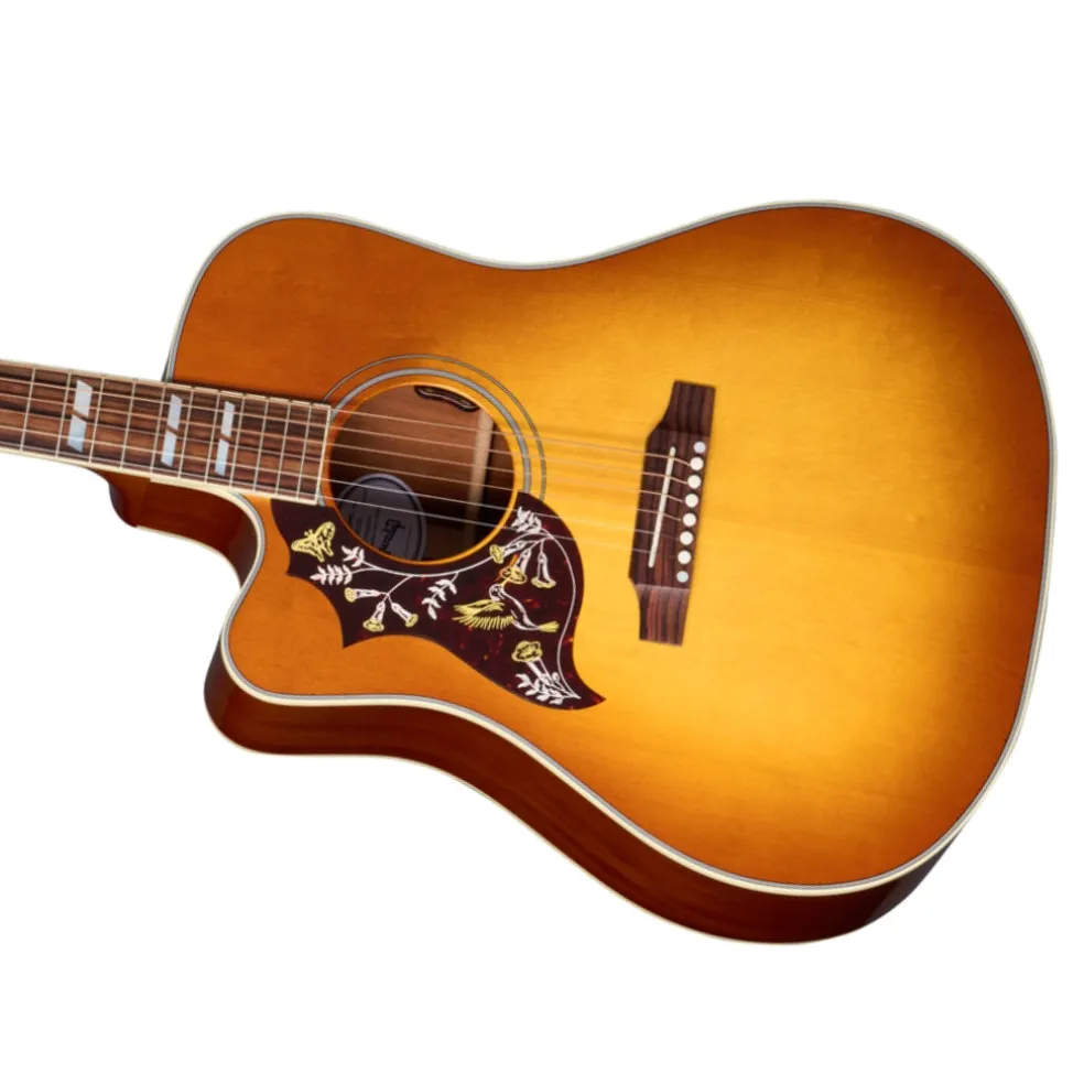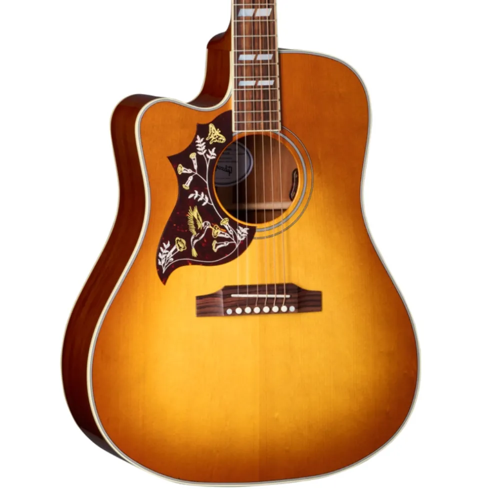 The Gibson Hummingbird™ is known for its versatility. It has always been equally well suited for strumming first-position chords and taking the spotlight for picking lead lines. The Hummingbird has become more versatile and expressive than ever with the introduction of the Hummingbird Standard EC. Like the Hummingbird Standard, the Hummingbird Standard EC’s mahogany body and sweet, select Sitka spruce top are more than capable of holding down the rhythm in the hands of a rock and roll sideman or accompanying the most nuanced performance under the fingers of today’s alternative singer-songwriter, but with the addition of the cutaway on the Hummingbird Standard EC, the access to the upper frets is significantly increased, making this the Hummingbird of choice for lead players and others who require increased note range and enhanced expressiveness. The Hummingbird’s mahogany neck has a comfortable Round SlimTaper™ profile and mother-of-pearl parallelogram inlays. This ‘bird has a TUSQ® nut, saddle, and bridge pins, Grover® Rotomatic® tuners, the iconic Hummingbird graphics on the pickguard, and is equipped with L.R. Baggs™ VTC electronics, so it’s ready to plug in on stage or in the studio from the moment you take it out of the included hardshell stage or in the studio from the moment you take it out of the included hardshell case.