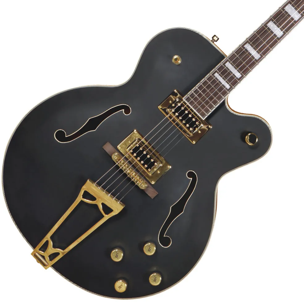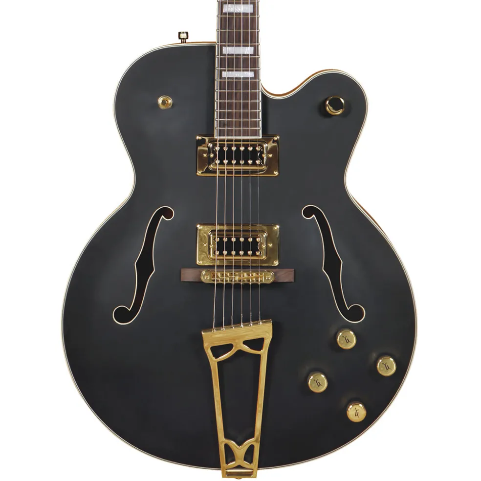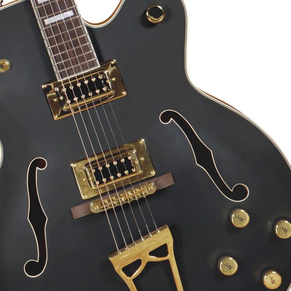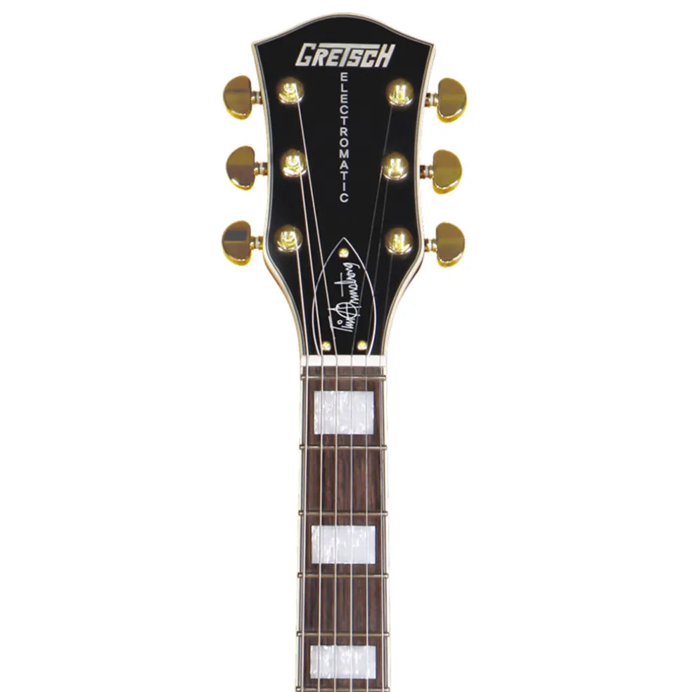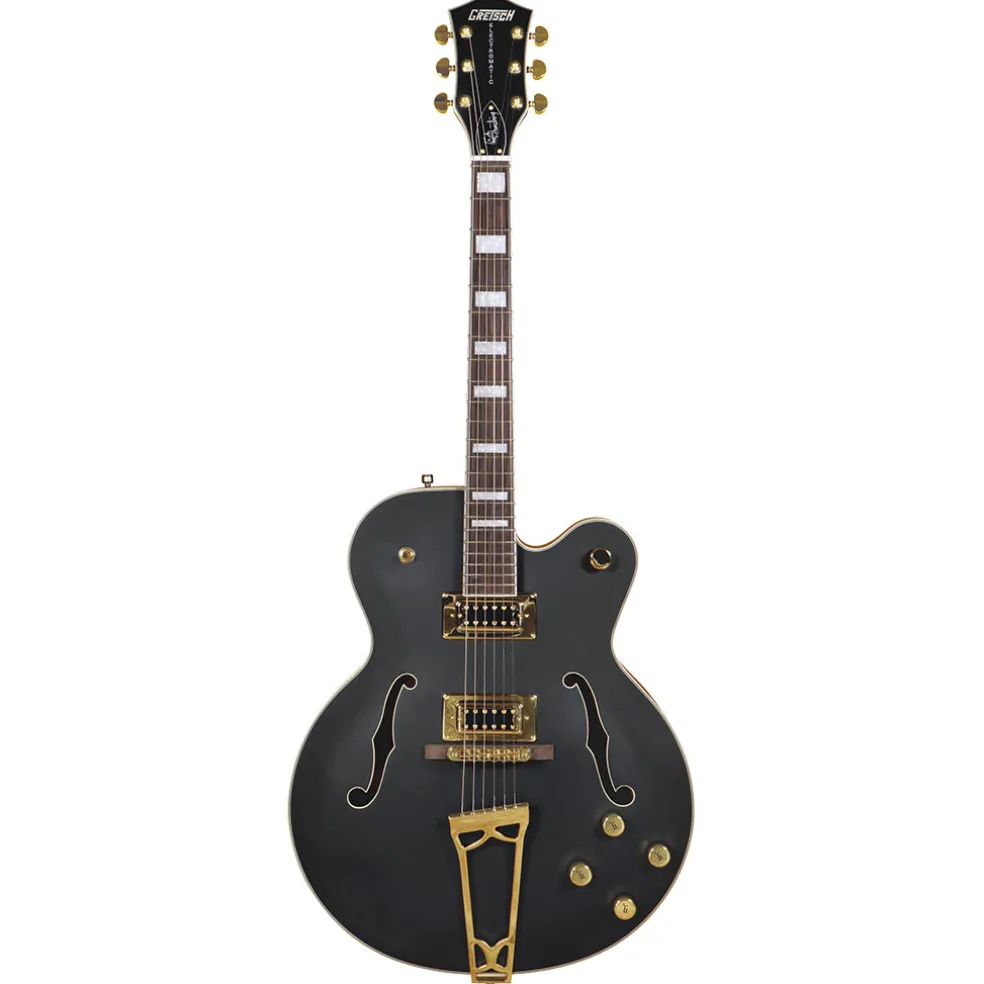 Huge tone resonates from deep within its bound single-cutaway hollow body, which features parallel tone bar bracing with sound post and bound F-holes. The one-piece maple neck has a white graphite nut and bound rosewood fingerboard with acrylic block inlays. Other features include dual Black Top Filter’Tron™ humbucking pickups with gold-plated bezels, three-position pickup switch, gold-plated hardware, bound headstock with pearloid Gretsch inlay and Armstrong’s signature on the truss rod cover, Grover® tuners, Adjusto-Matic™ bridge and harp tailpiece.