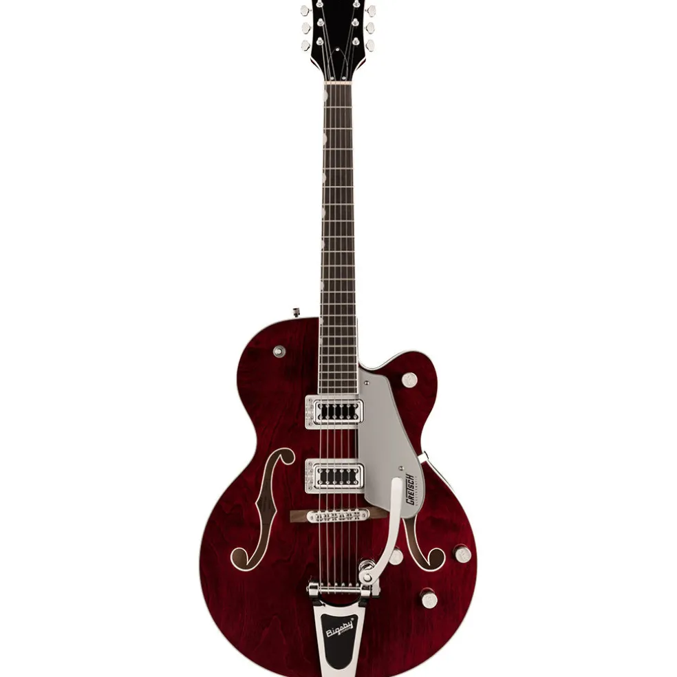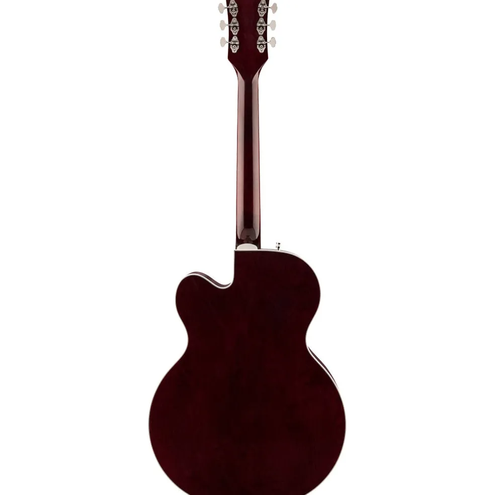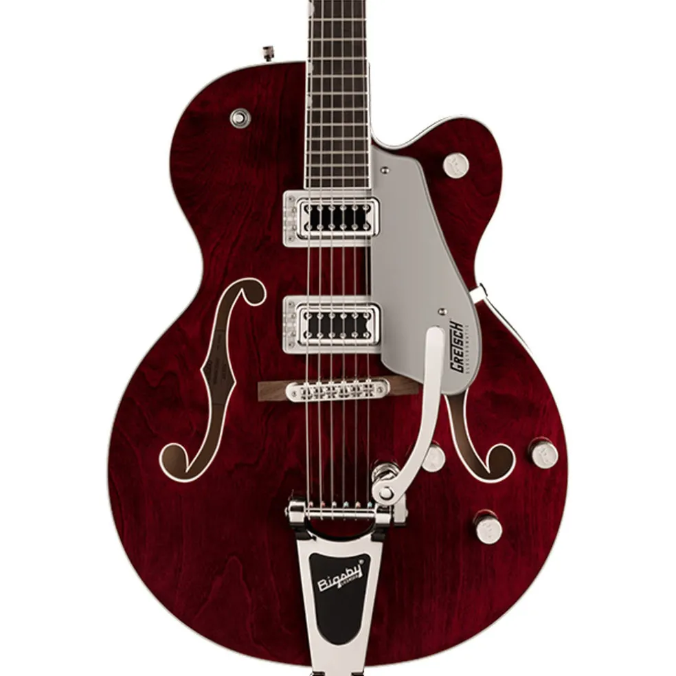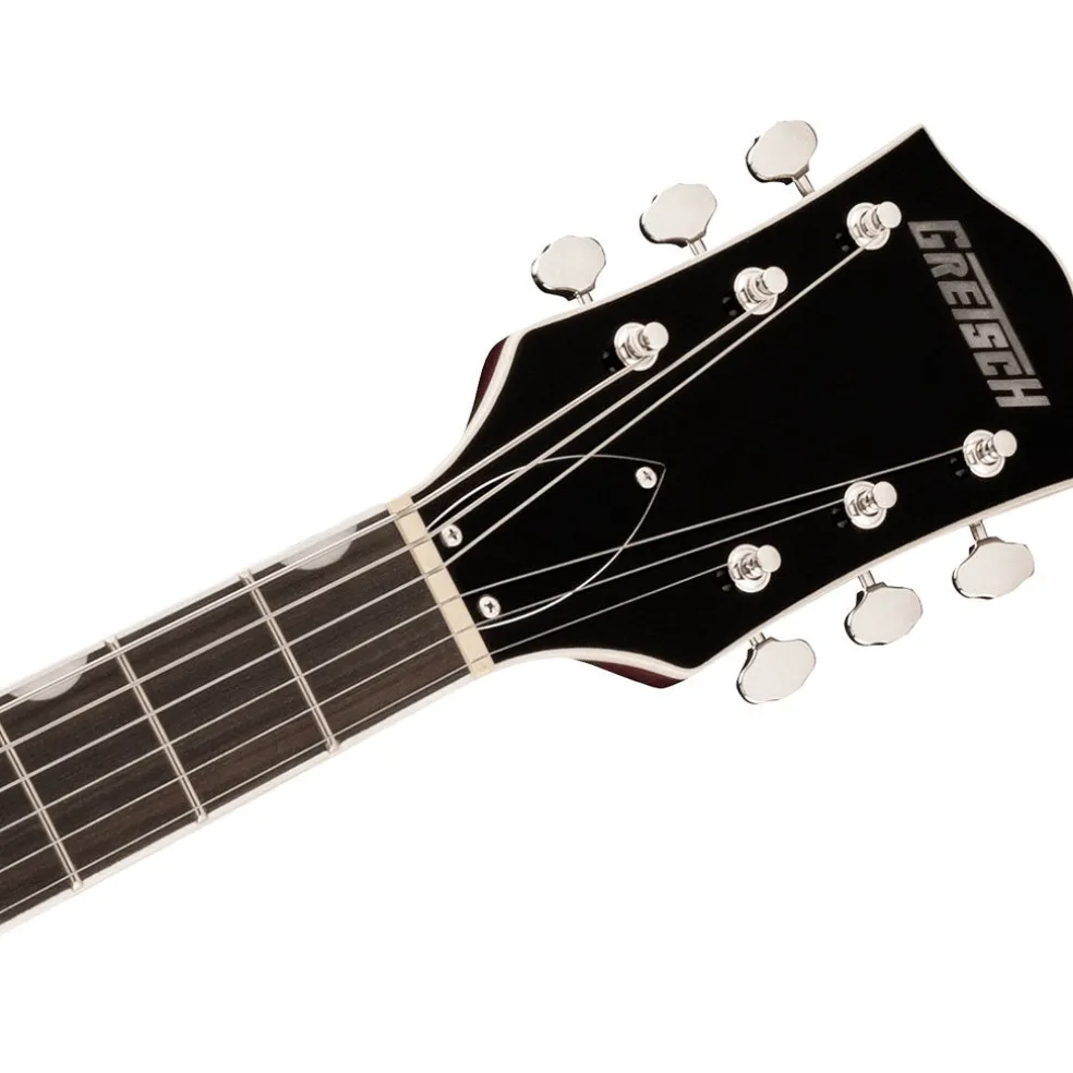 Alive and resonant, the G5420T also features a versatile upgraded control layout including master volume with treble bleed circuit, master tone, individual pickup volume controls and three-position pickup toggle switch, oversized bound F-holes, multi-ply body binding, smaller late-50s G6120 bound headstock, vintage-style open-back tuning machines, Graph Tech® NuBone® nut, pearloid Neo-Classic™ thumbnail inlays, secured Adjusto-Matic™ bridge and a Bigsby® B60 vibrato tailpiece.