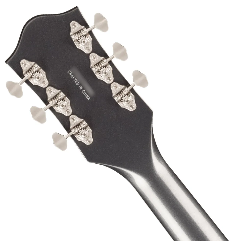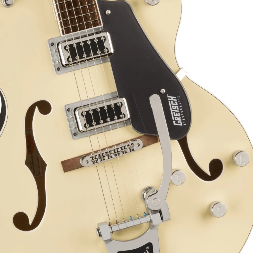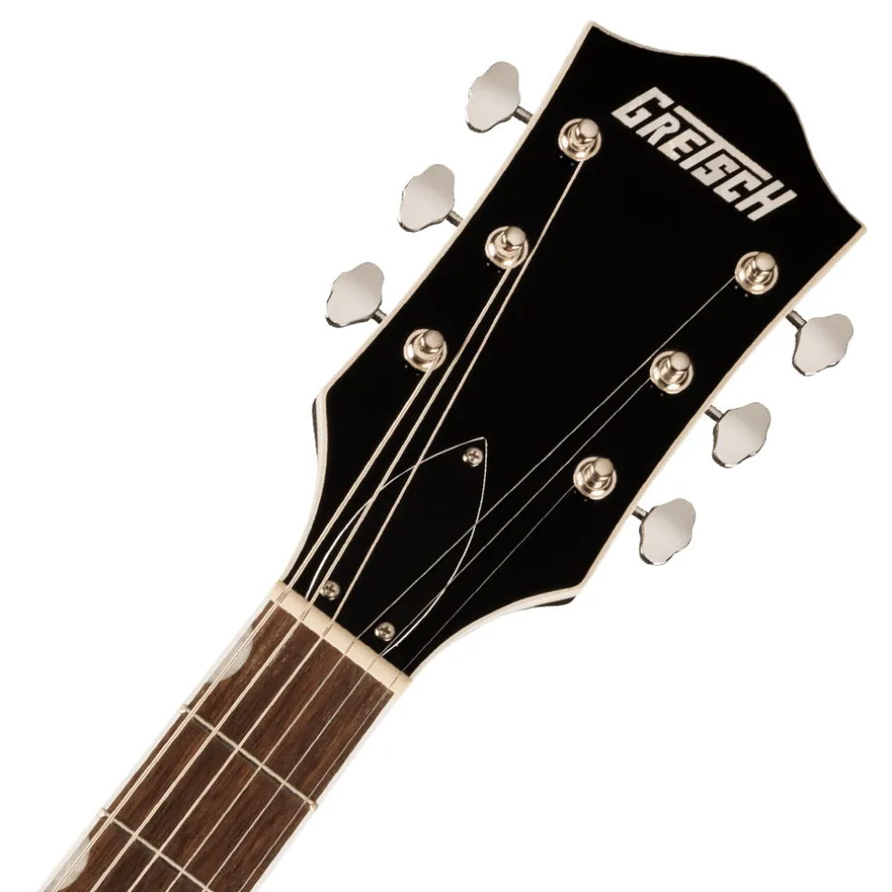 Alive and resonant, the G5420T also features a versatile upgraded control layout including master volume with treble bleed circuit, master tone, individual pickup volume controls and three-position pickup toggle switch, oversized bound F-holes, multi-ply body binding, smaller late-’50s G6120 bound headstock, vintage-style open-back tuning machines, Graph Tech® NuBone® nut, pearloid Neo-Classic™ thumbnail inlays, secured Adjusto-Matic™ bridge and a Bigsby® B60 vibrato tailpiece.