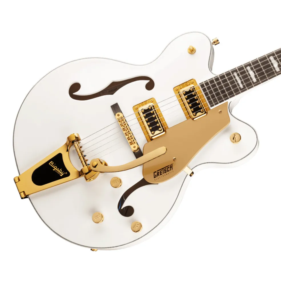 The G5422TG Electromatic® Classic Hollow Body Double-Cut with Bigsby® and Gold Hardware features a laminated maple body with vintage-inspired perimeters and refined arches, as well as all-new trestle block bracing to help reduce unwanted feedback. By increasing rigidity and contact between the top and back of the body, the new trestle block design also results in the sound having a faster attack with more focus, snap, and increased sustain. Coupled with all-new FT-5E Filter’Tron™ pickups, this hollow build’s voice explodes with huge full-bodied punch, classic chime and enhanced presence, clarity and note definition.