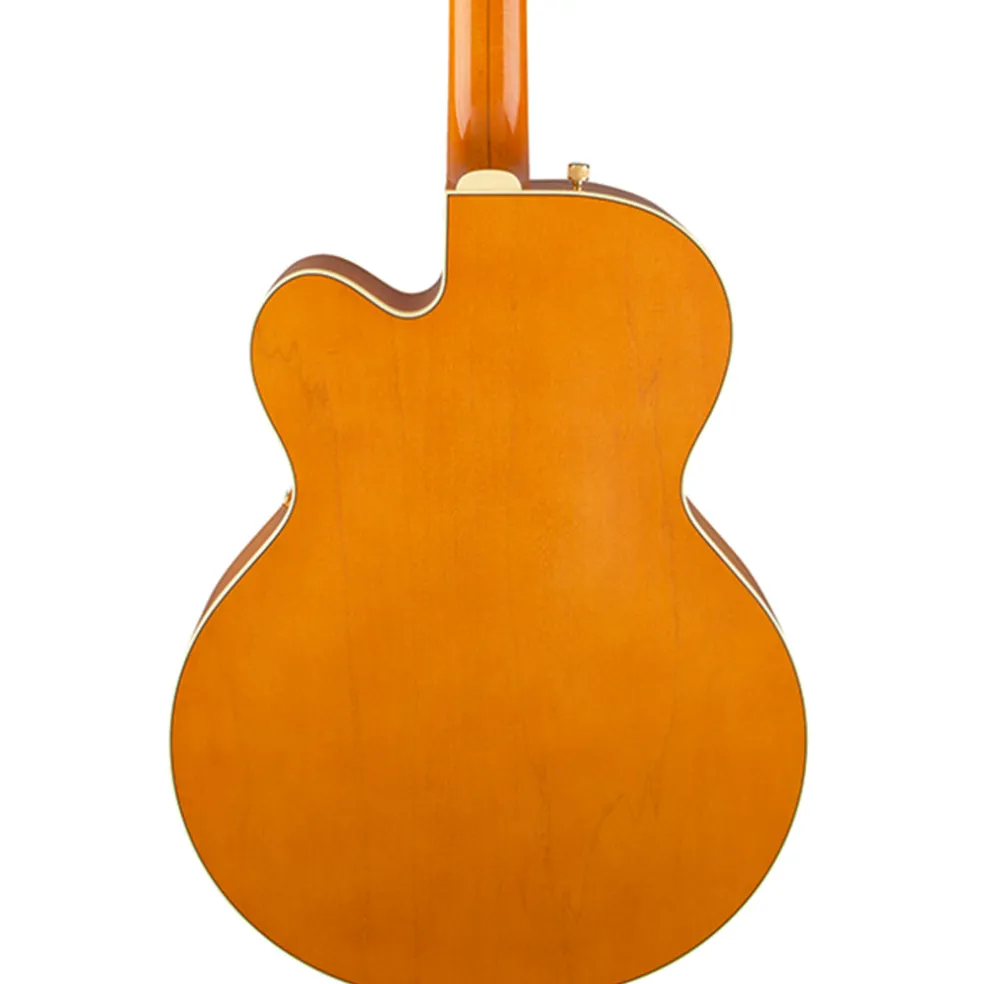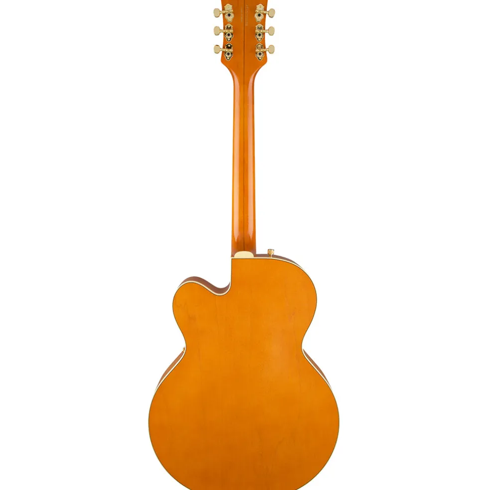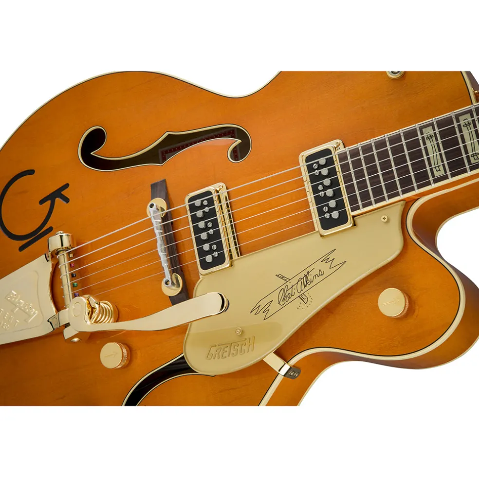 A pair of TV Jones® T-Armond single-coil pickups creates multi-dimensional tone with plenty of articulate detail. Traditional Gretsch controls allow you to blend and shape the pickups’ sounds, creating countless tonal variations. Add the new Gretsch “Squeezebox” paper-in-oil capacitors and you get incredibly smooth taper and silky vintage high end. The standard “U”-shaped maple neck bears a 12”-radius ebony fingerboard with 22 medium jumbo frets for a memorable playing experience that works with any fret-hand style. A pinned aluminum compensated bridge works with the Bigsby B6GBVF vibrato tailpiece for stable tuning while the vintage-style polished aluminum nut delivers signature snappy twang.