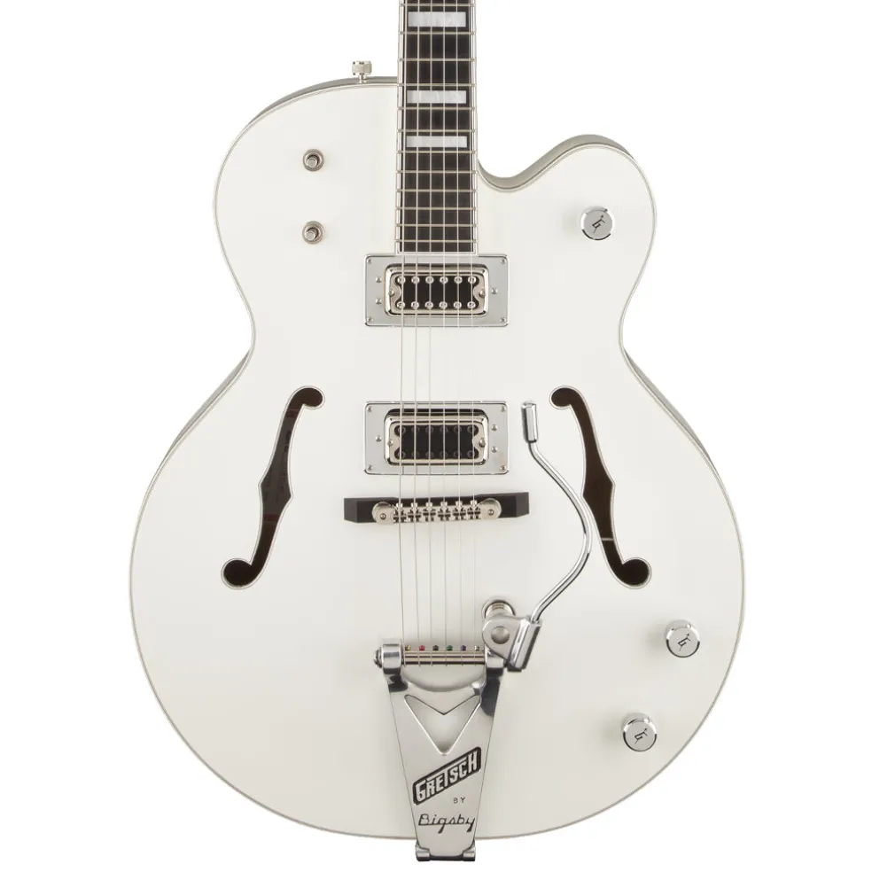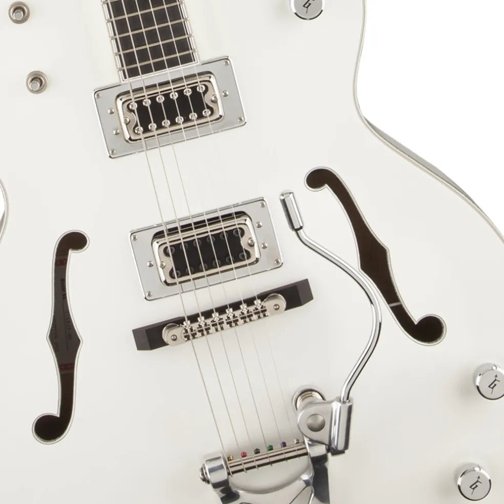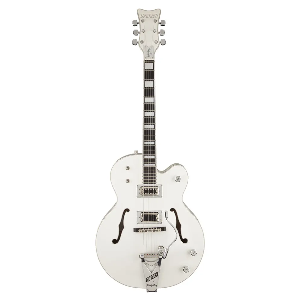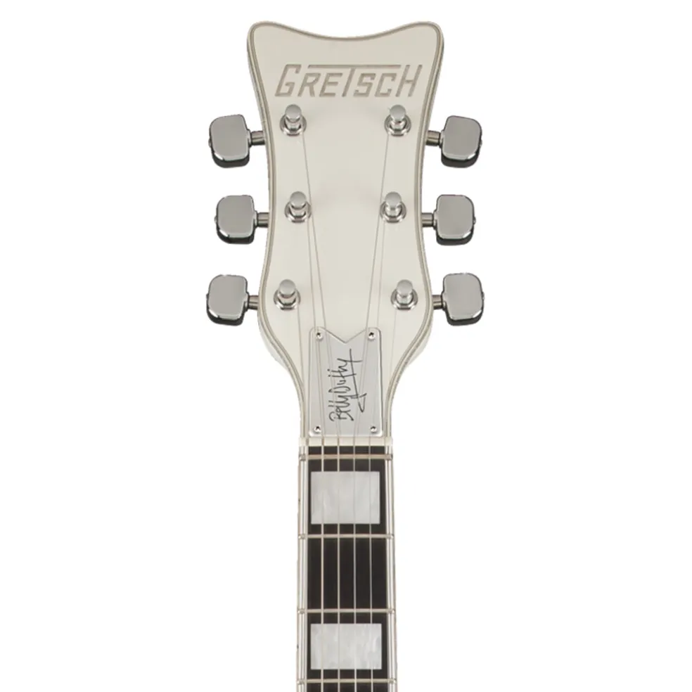 It is with great pleasure that Gretsch released the G7593T Billy Duffy Falcon guitar, which has immediately become one of the most unique and bewitching White Falcon guitars ever made. Featuring much of what Falcon fans hold dear, Duffys inimitable guitar has several unique aesthetic differences separating it from the rest of the Falcon flock—its period-correct 70s Baldwin-era styling, gloss nitrocellulose lacquer finish, V-shaped Falcon headstock, Silver Sparkle binding, custom wound hot Black Top FilterTron humbucking pickups with three-point adjustable 70s-style metal bezels and Duffys preferred Bigsby tailpiece.