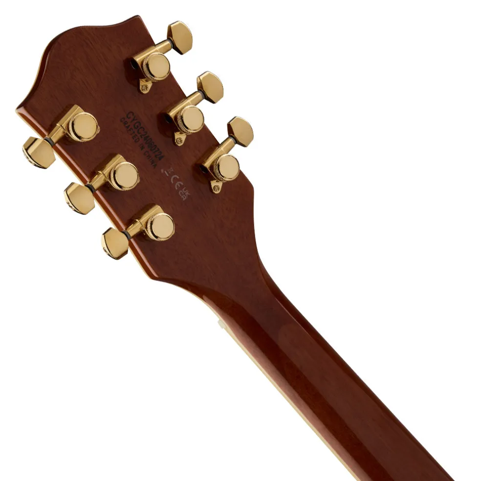Featuring a beautiful flame okoume double-cutaway body, rosewood fingerboard, USA Full’Tron™ pickups, jeweled G-Arrow control knobs, and gold hardware, the elegant style and premium sound quality of this Limited Edition Broadkaster® is sure to turn heads.