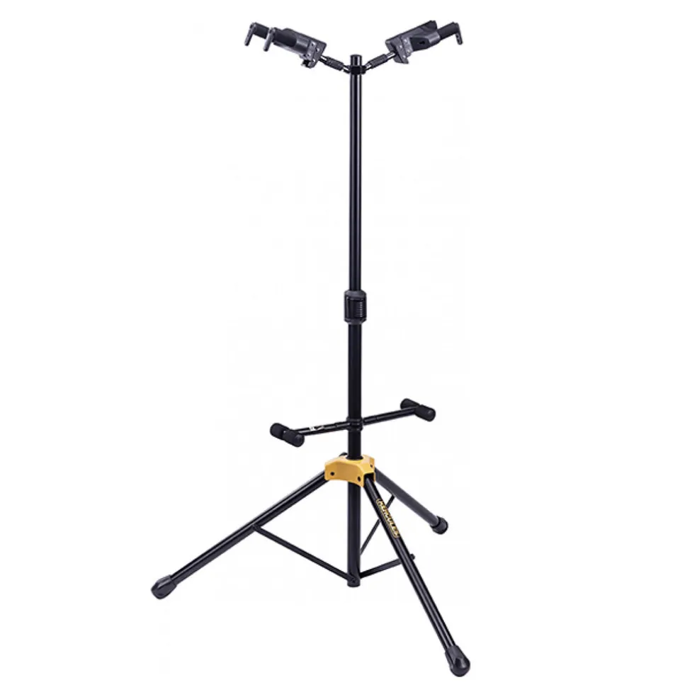The HERCULES Double Guitar Stand GS422B PLUS accommodates two instruments and features the upgraded foldable Auto Grip System (AGS) yokes, Instant Height Adjustment Clutch, Specially Formulated Foam (SFF) rubber contacts and the adjustable back rests.