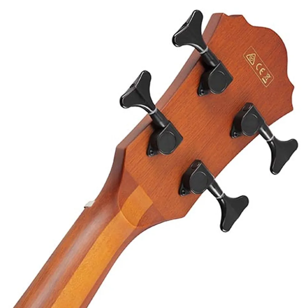 The Ibanez AEGB24E acoustic bass guitar features a 3-pc Nyatoh/Maple Neck which provides a rich mid-low end and great resonance. The Sapele top, back and sides delivers a warm mid-range and a bright tone. A Walnut fretboard for a well-balanced tonal character from low to high end. The Walnut bridge transfers string vibration directly to the body, delivering a natural and warm tone.